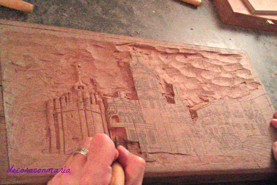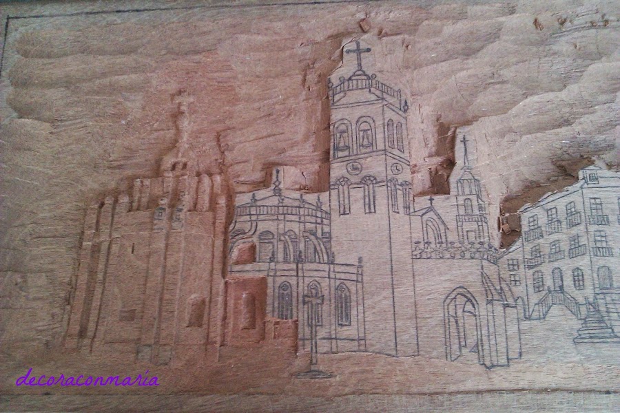 1- He realizado el dibujo en papel y luego lo he pasado a la madera, siguiendo una fotografía tomada de la Catedral, con mi cámara