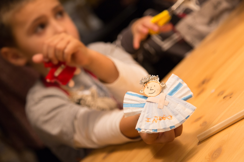 La dinámica se hizo en 4 grupos. Los padres y madres iban rotando de un taller a otro hasta completarlos con mis compis, y los peques y yo después de ver unas cuantas ideas para hacer servilleteros, nos pusimos manos a la obra con el servilletero ángel.