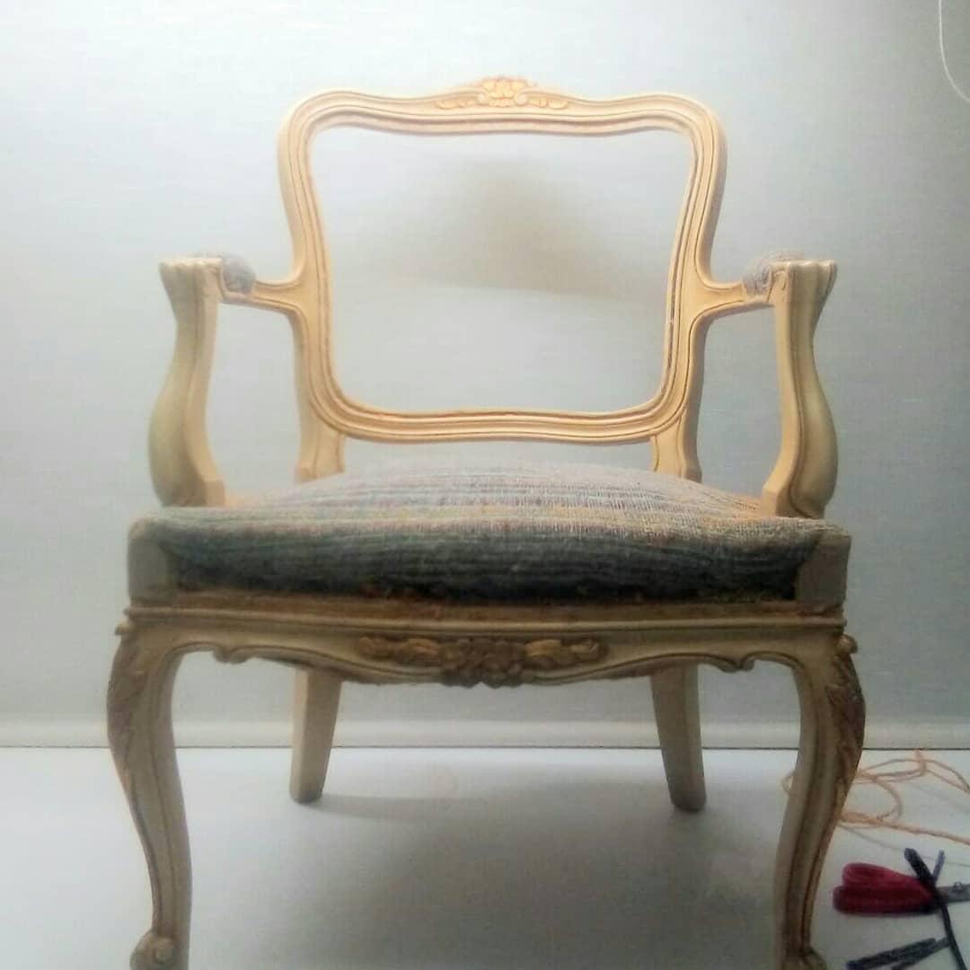 Nuestro trabajo consistió en lijar la pintura que tenía, poner cinchas nuevas, reparar los muelles, cambiar toda la espuma y tapizar de nuevo.