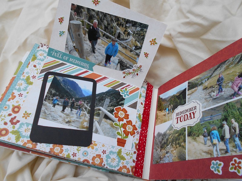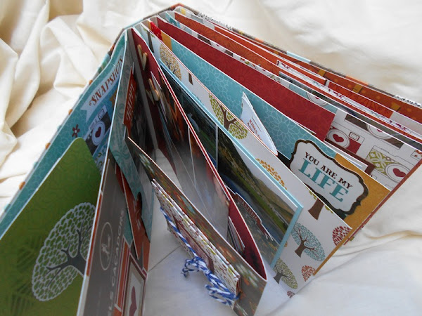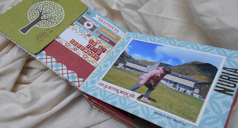Esta vez tocó hacer un mini álbum con encuadernación en espina. Lo hicimos con una colección de Simple Stories, que siempre triumfan. Os pongo algunas fotos.