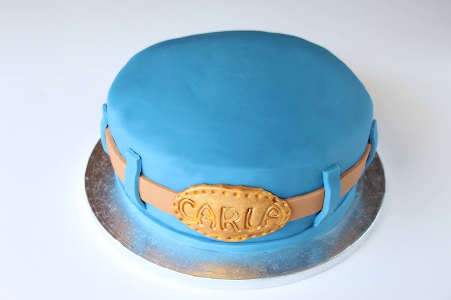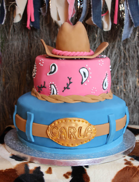 La tarta inferior simulaba a unos vaqueros, con su cinturón y en la hebilla dorada el nombre de la cumpleañera.