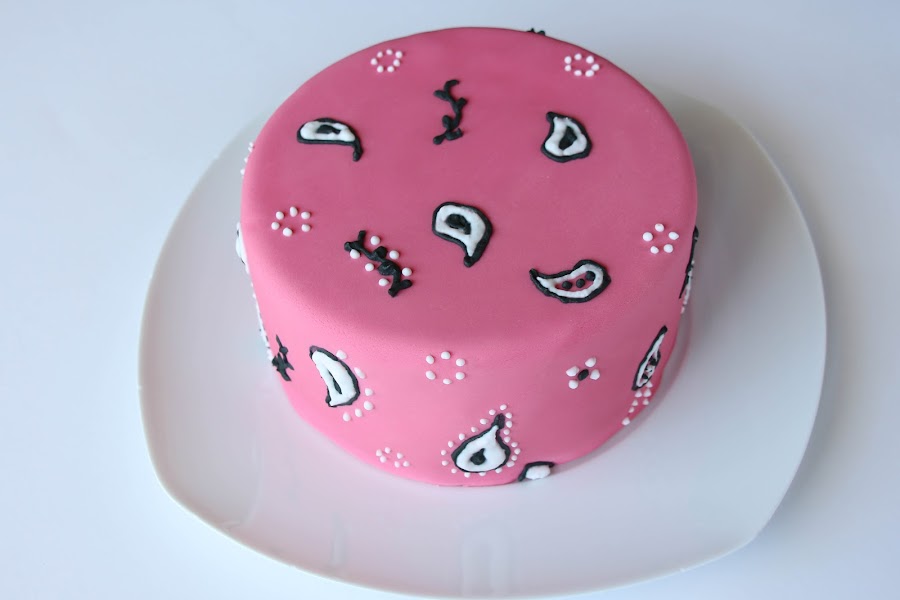La tarta del piso superior estaba decorada como una bandana rosa, estaba forrada con fondant de color rosa, e hice las decoraciones simulando el estampado de la bandana con glasa de delineado de color negro y blanco.