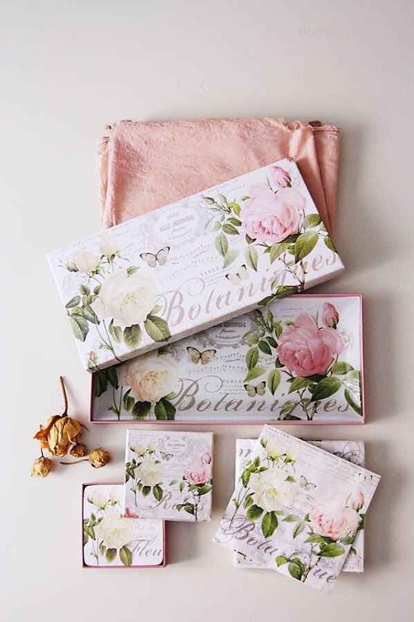 decoradas con las maravillosas ilustraciones de rosas de Redouté.