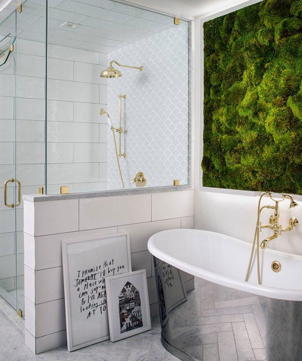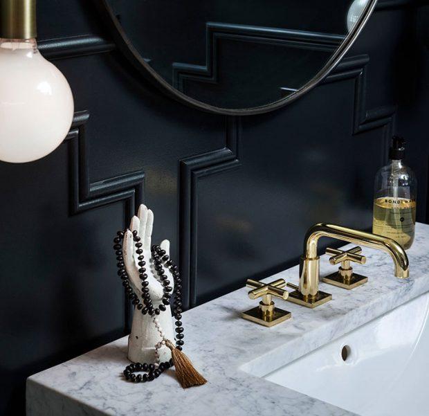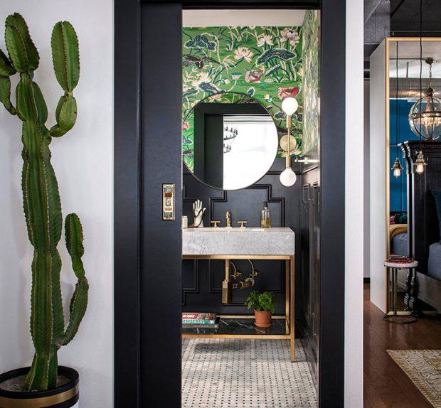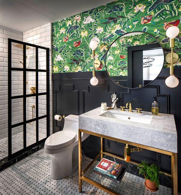 ¿Molduras en la pared del baño? Nadie lo habría visto, pero combinado con ese papel tropical, le da un aire sencillamente espectacular.
