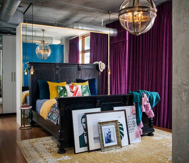 Pero destacaría no solo la arquitectura, si no cada una de las piezas tapizadas o esas cortinas con las que de manera majestuosa admiramos el volumen y las sombras con las por ejemplo ese telón del dormitorio consigue dar ese aire burlesque a la decoración.