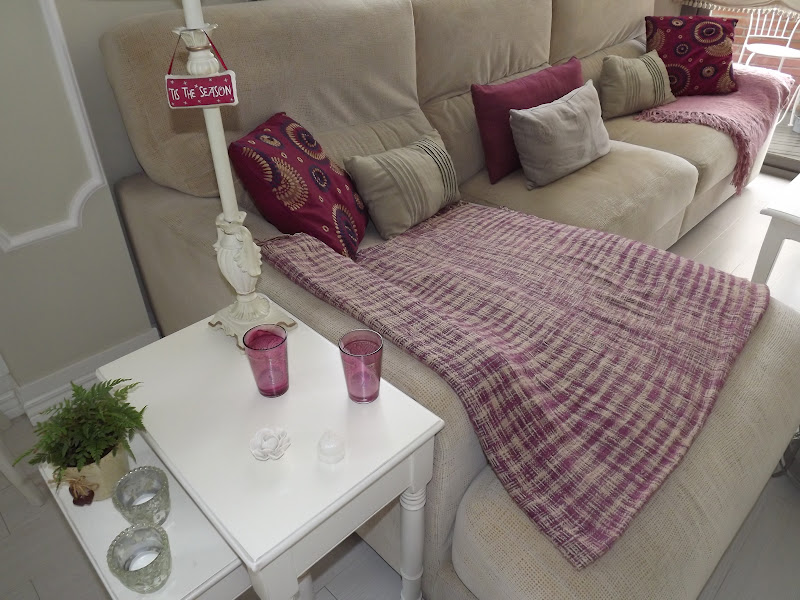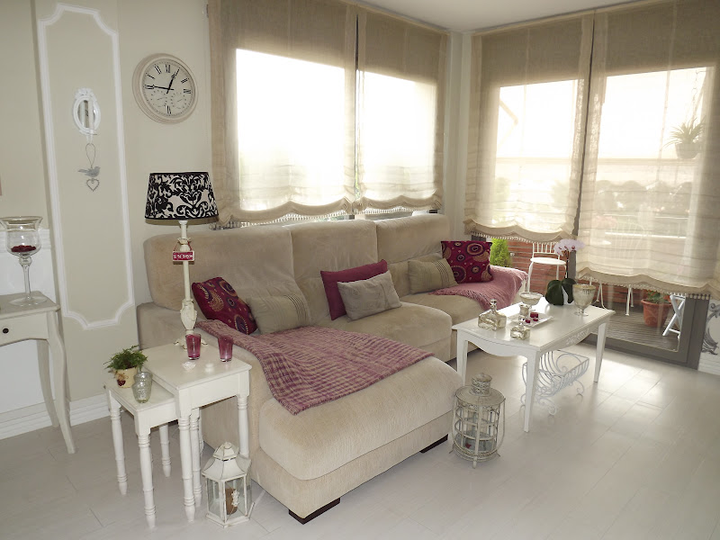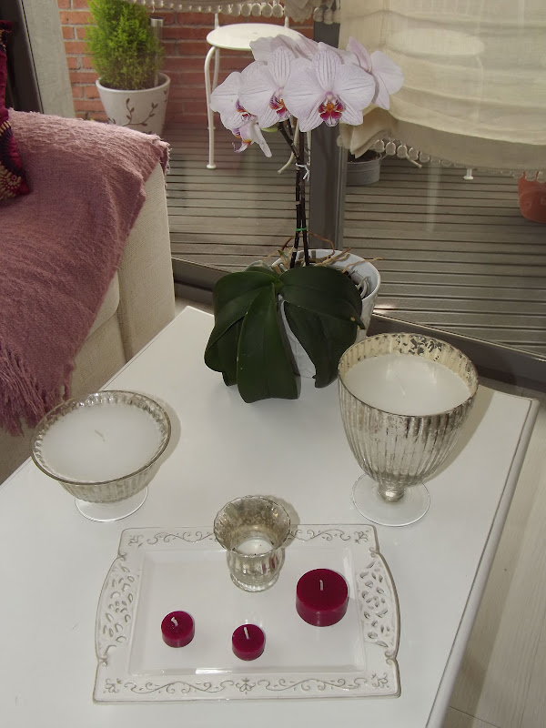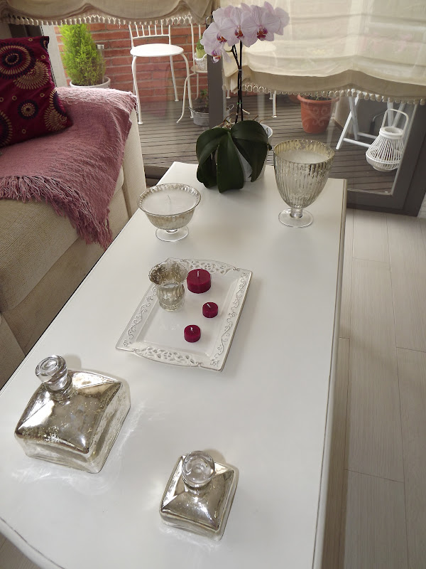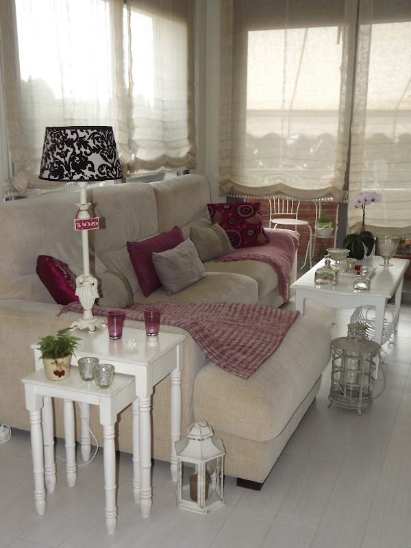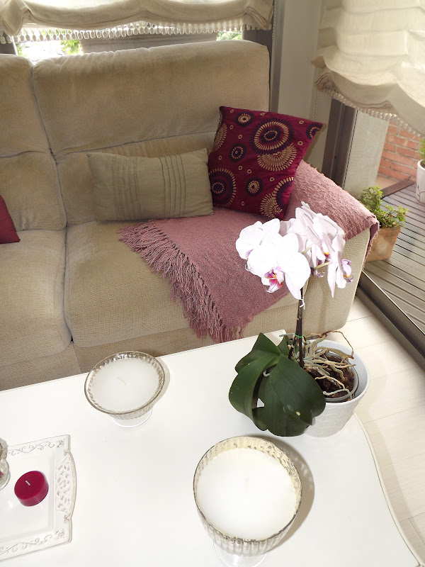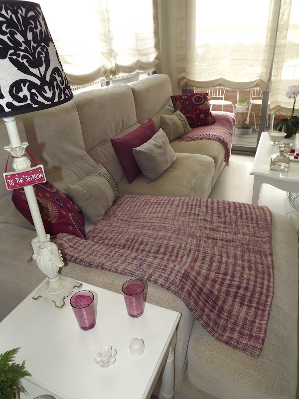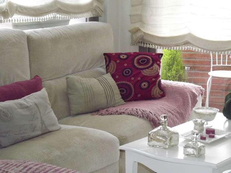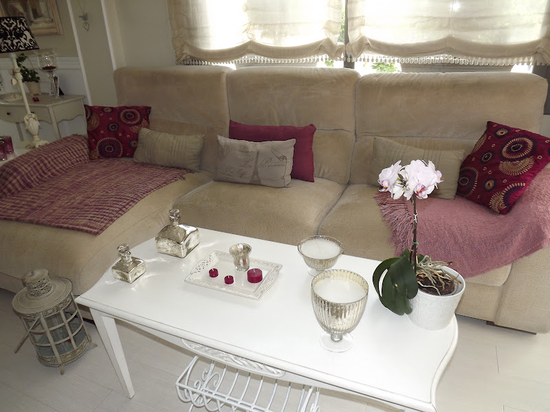 Con este calorcito toca cambio de cojines en el sofá del salón...notas de color para la llegada del verano con toques de rosa en velas,cojines y complementos.Dejo atrás mi manta de pelo en color crudo que tanto nos ha abrigado en el frío del invierno dando paso a tejidos frescos como el satén y los plaids de algodón. Reparto faroles que tanto me gustán en blanco decapado y, como no,una orquidea en la mesita,no pueden faltar las plantas que siempre alegran cualquier estancia...Ya está,mi salón se ha vestido de primavera,parece otro,tan solo con unos pocos cambios para recibir el buen tiempo.