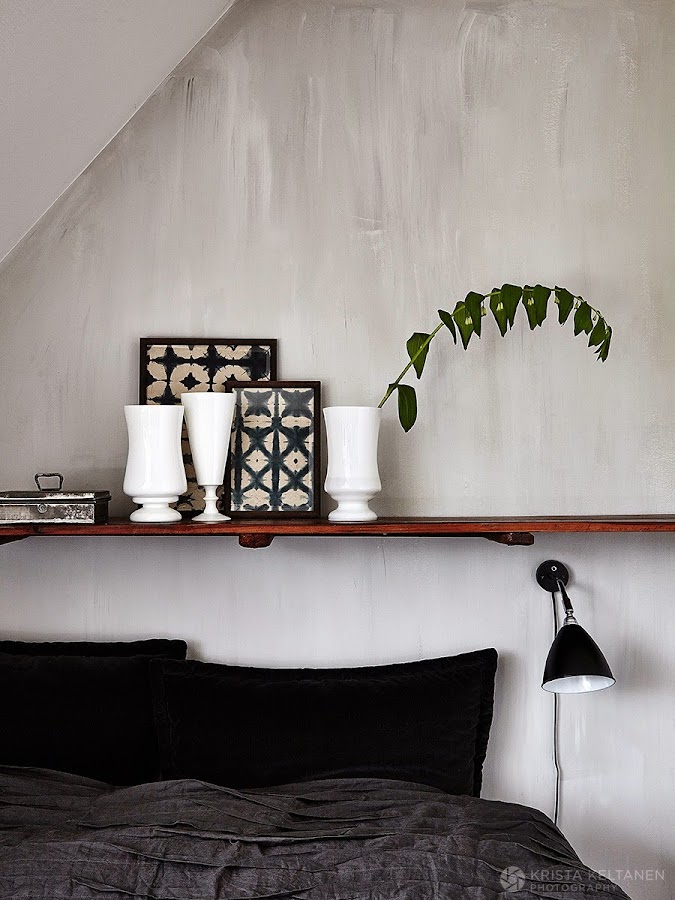 Una vivienda en la que los blancos y negros son la base cromática y en la que no faltan los muebles de madera reciclada en tonos oscuros que resaltan entre los tejidos más claros. La sencillez en la decoración del dormitorio y la simplicidad del baño una vez más nos dicen que no hace falta mucho para darle personalidad a cualquier parte de la casa.