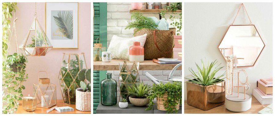 La esencia de esta tendencia está en combinar materias naturales con otros materiales brutos totalmente modernos, como por ejemplo utilizar una maceta de material de obra para un cactus. Los metales también están muy presentes, sobre todo en tonos bronces, así como los cestos y los objetos de vidrio.