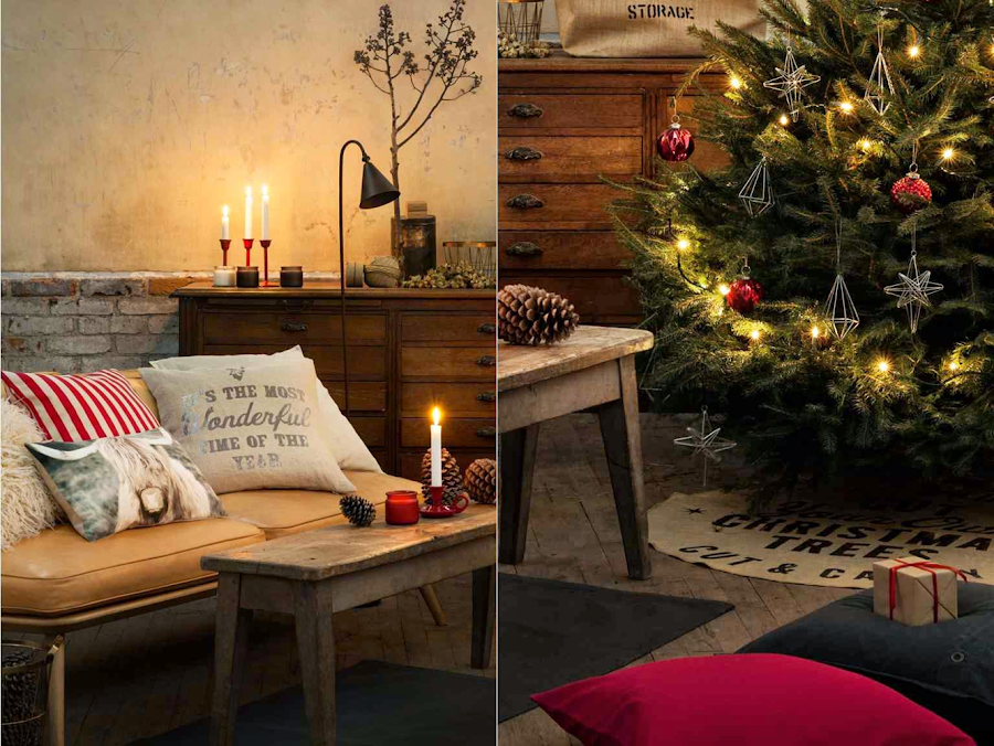 Otra de las apuestas de H&M, también es la decoración tradicional para estas navidades. Con el rojo como el absoluto protagonista de esta propuesta, combinado con la madera, textiles rústicos, cuadros escoceses, se consigue un interior de decoración vintage. Todo un clásico para un típico ambiente navideño, cálido y acogedor, que invita a la celebración de estas entrañables fiestas en familia.