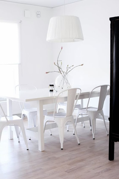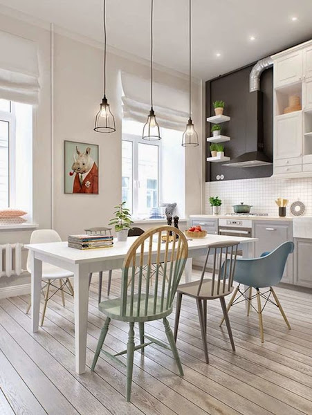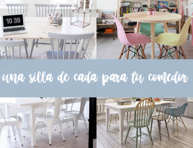 Aunque también podemos apostar por mezclas imposibles, lo ideal es mezclar diferentes estilos de sillas dentro de un mismo color, así unificamos. Si recordáis en mi comedor de Valencia o incluso en el de la casa nueva lo hemos hecho así y el blanco como el hilo conductor.
