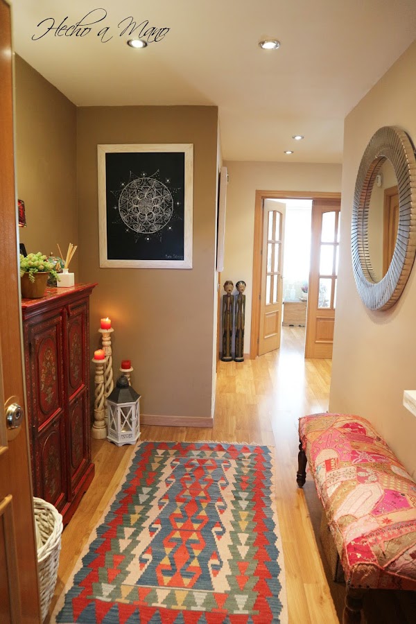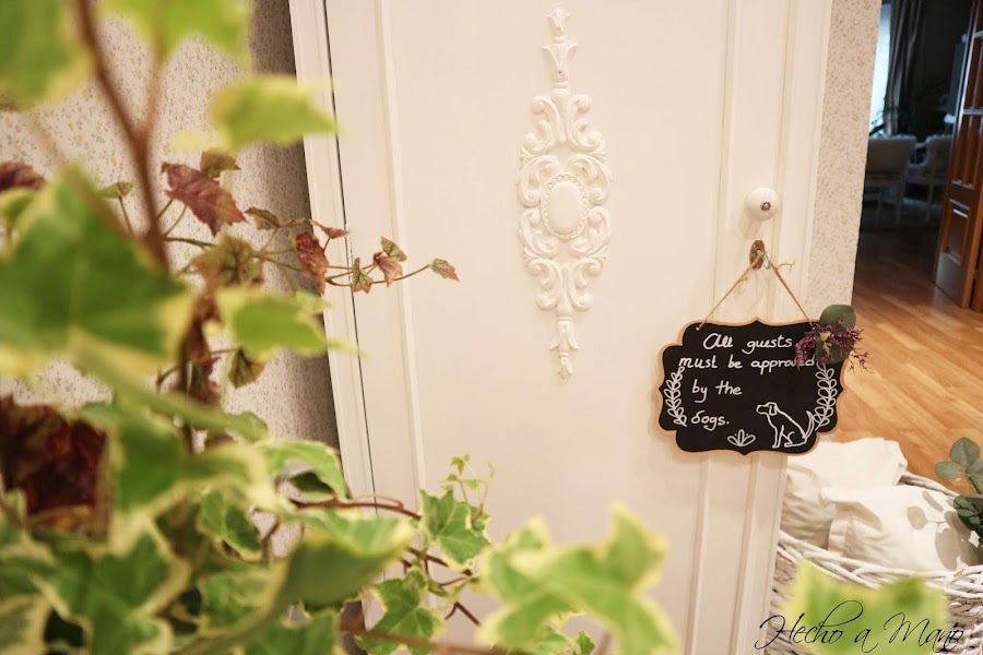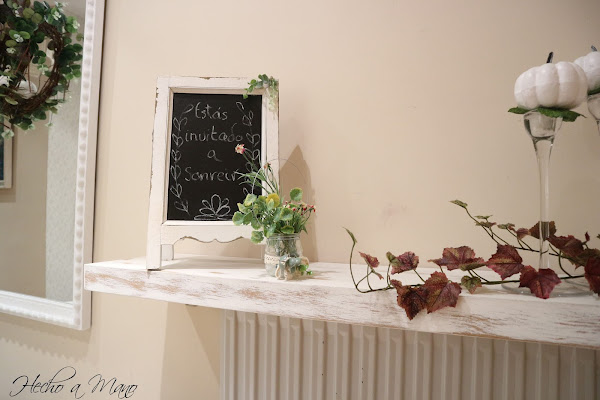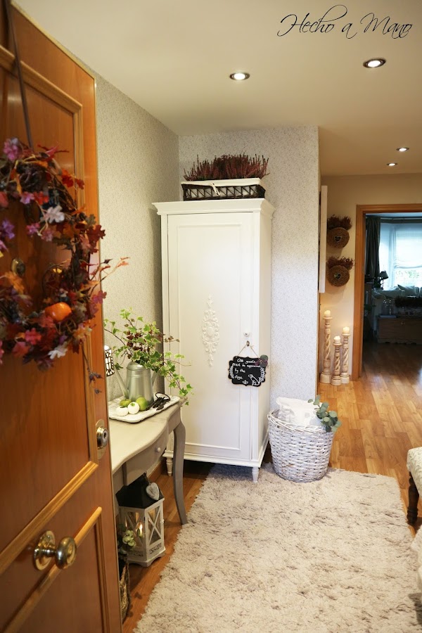 Lo que viene ahora es lo que me queda por cambiar. Quiero hacer un mueble para cubrir el radiador, en breve. De momento. Mi cartel que invita a sonreír a nuestras visitas y alguna calabaza entre hojas otoñales, reposan sobre ésta balda en espera de su nuevo mueble.