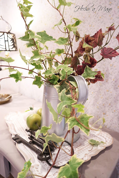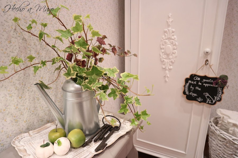 Al otro lado de la consola, una bandeja aloja una regadera con hojas de hiedra y otra variedad rojiza y muy otoñal. Pequeñas calabazas y verdes manzanas junto a unas antiguas llaves dan el toque final al conjunto.