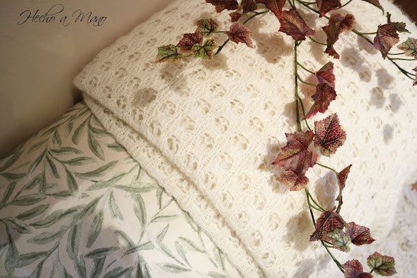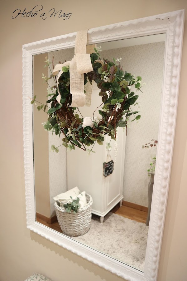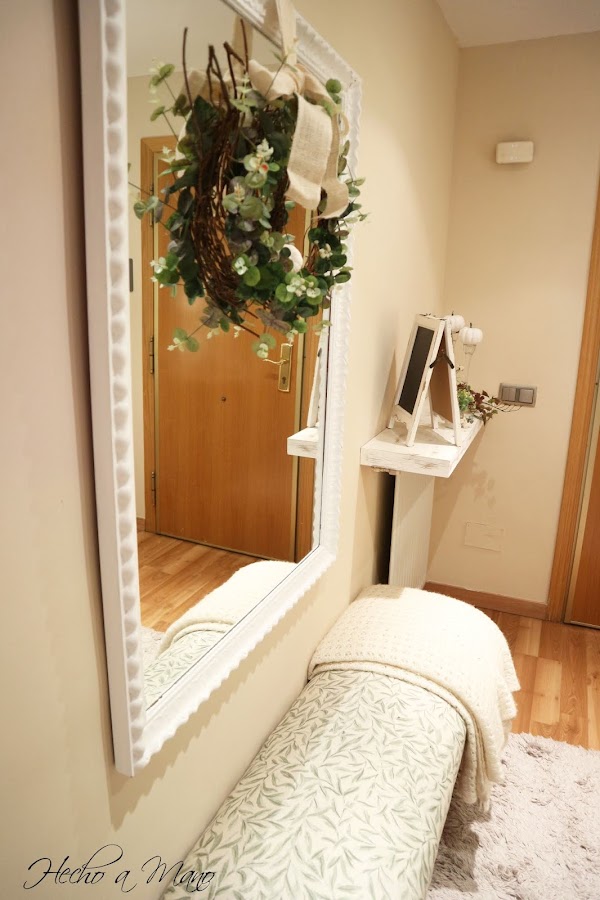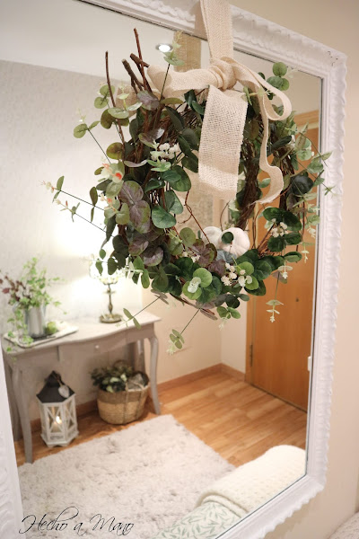 Al otro lado, cambio de espejo pintado por mi porque era plateado y sobre su luna, decidí fabricar una coronita de eucalipto que aromatiza gratamente el espacio. Retapicé la banqueta con igual tela que la lámpara de la consola y para dar más calidez en ésta época he dejado descansar sobre ella una manta de lana en un tono blanco roto.