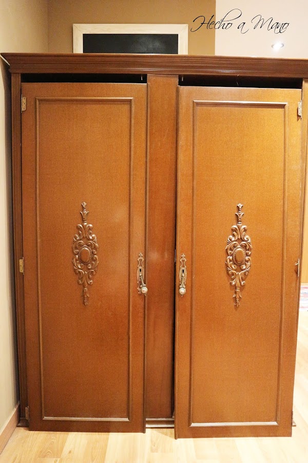 El problema fue que era demasiado grande para el sitio que queríamos que ocupara. Pensamos en ponerlo en otra estancia, pero lo cierto es que dónde lo necesitábamos era justo ahí, así que ni corta ni perezosa decidí disminuir su tamaño, ahora sería un armario de un cuerpo. Mi santo se me unió y he de decir que ha currado tanto como yo. Me ha ayudado muchísimo y he descubierto que formamos muy buen tandem, cosa que él niega y reniega. No le interesa para nada mostrarse mañoso en estos menesteres. ¡No vaya a ser que le reclame con más frecuencia!. Después de sierra de calar, lijadora, masilla, cola.....y un largo etc. de materiales, el nuevo armario vio la luz, pero a la segunda, porque una vez montado , pegado y enmasillado, vimos que habíamos tomado mal las medidas y la puerta se colaba dentro.¡¡¡Ay que desesperación. A empezar otra vez!!! Fue un "parto" complicado pero muy exitoso. También tuvimos que poner nuevas patas porque en su momento mi padre las quitó y se perdieron. Te muestro ya a nuestra "criatura".