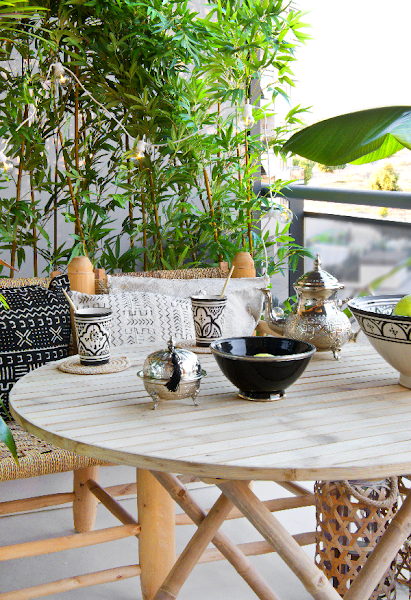 En cuanto a la decoración, sugerimos un espacio con aires tropicales, a la vez que incluimos detalles étnicos en textiles y complementos para la mesa, los conocidos cojines confeccionados con telas de mali no pueden faltar en nuestra pequeña terraza, así como una guirnalda muy sencilla y veraniega que aporta calidez por las noches.