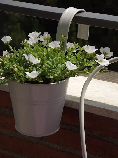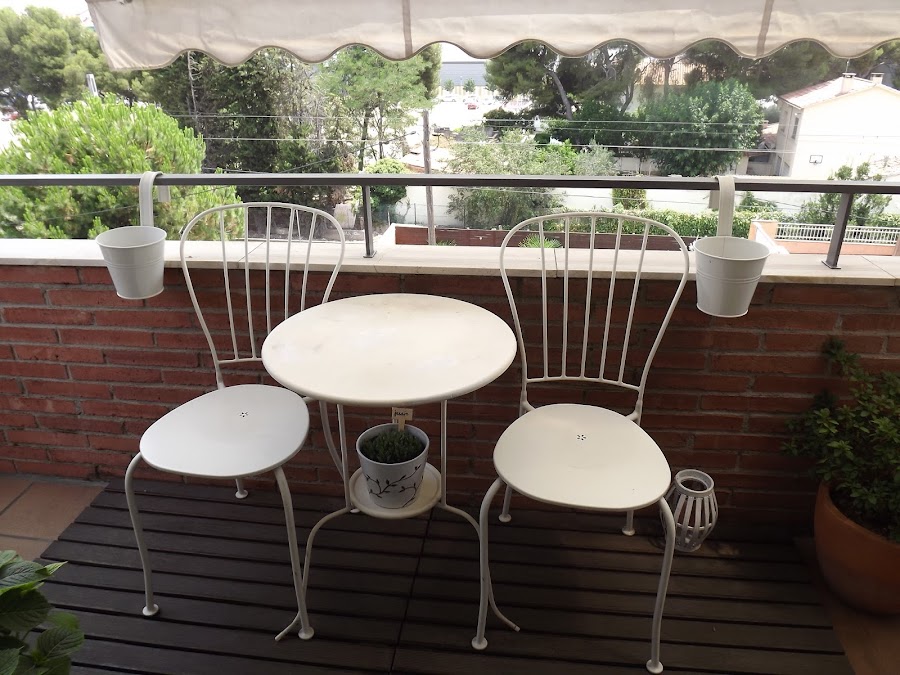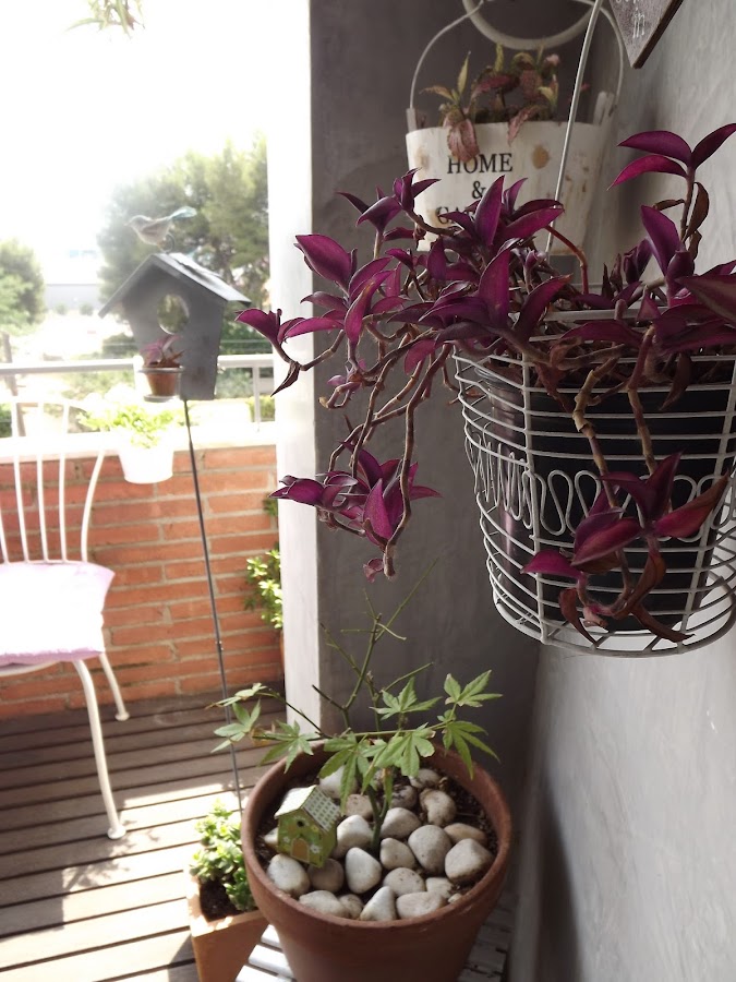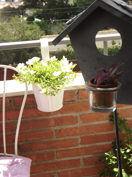 Entonces le añado plantas, algunas verdes y otras en flor encima de la coqueta mesa redonda.Ya va adquiriendo colorido y sobre todo muchísima vida. Pero mis jardineras colgantes permanecen vacías, no puede ser, necesitan plantas colgantes que las haga resaltar...