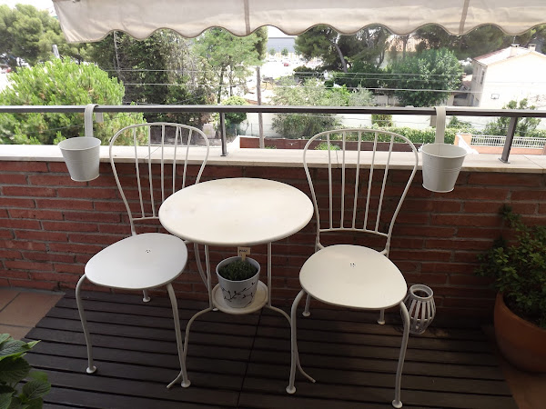 Buenos días de lunesssssssssssssss a todas...Desconectada he estado todo este fin de semana, de aquí para allá, un kit kat que muchas veces viene de maravilla. Pero ya estoy de nuevo por aquí con nuevas instantáneas que mostraros en esta ventana. Y hoy os vengo a enseñar la importancia de los textiles, los detalles y las plantas en nuestros pequeños espacios exteriores. Fijaros en la primera de las fotos, mi pequeño vergel repleto de lilas, vestido para disfrutar del verano. Sin embargo también podría lucir así, tan solo con el mobiliario en blanco, sin cojines, sin mantel, sin flores, hasta sin solecito que se ausenta por la sombra del gran toldo...