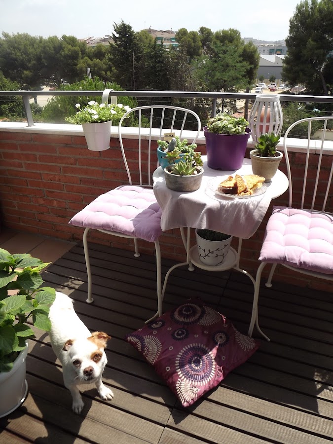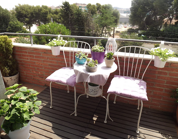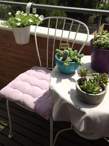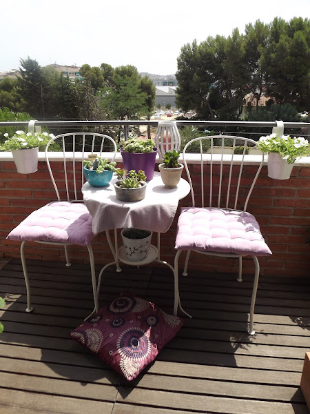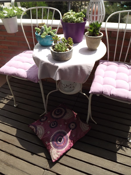 Mis cojines mullidos en tonos lilas y el sencillo mantel en el mismo color, textiles incondicionales si queremos aportar calidez a nuestros balcones y terracitas...Pero sigue estando vacío, ¿no creéis?...