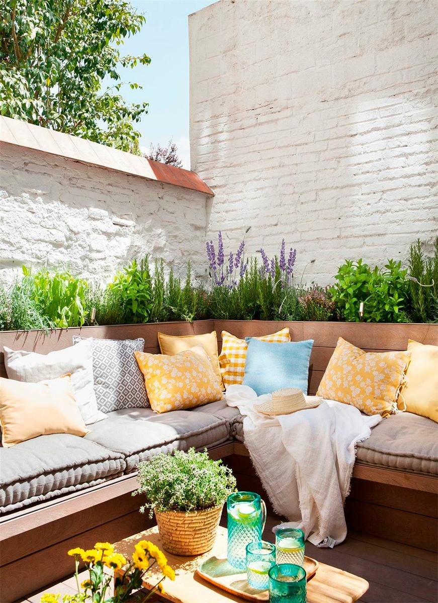 Los diseños tipo palet, son perfectos porque se adaptan a pequeños espacios. Ya no hay que ser un manitas si no sabes hacerlos tú mismo, si quieres algo tipo banco ya montado te lo venden hecho y con sus cojines a medida. Otra cosa es que quieras algo más sofisticado, entonces tendrás que tirar de ingenio y destreza. (Imagen: homyfeed).