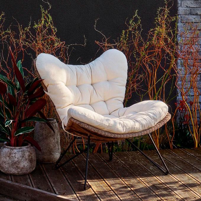 Quizás sólo dispongas de una pequeña esquina en tu terraza o balcón, entonces asegúrate la máxima comodidad con piezas como esta que recojan bien tu cuerpo. Se trata de una butaca de plástico reciclado que puedes encontrar en La Redoute.