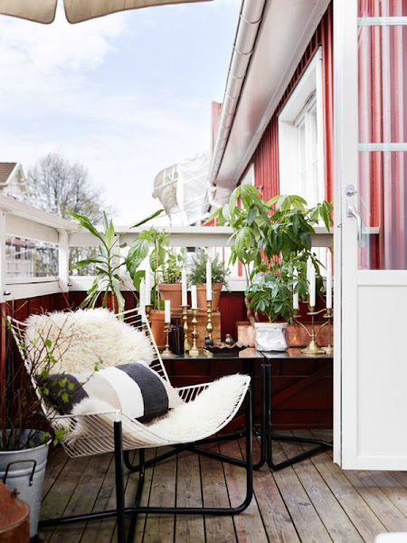 Las terrazas no son sólo para el verano, sobre todo si tenemos la suerte de que sean cubiertas. Como en esta terraza nórdica que, a la vista está, se disfruta incluso en el crudo invierno. Como si fuera un porche y en un marco blanco, se han añadido piezas de color que le dan mucha alegría. Flores y plantas escogidas, plantadas en macetas y pequeños capazos, cojines y mantas de piel y de tela, asi ...