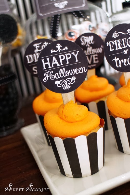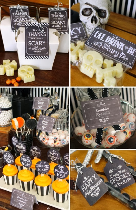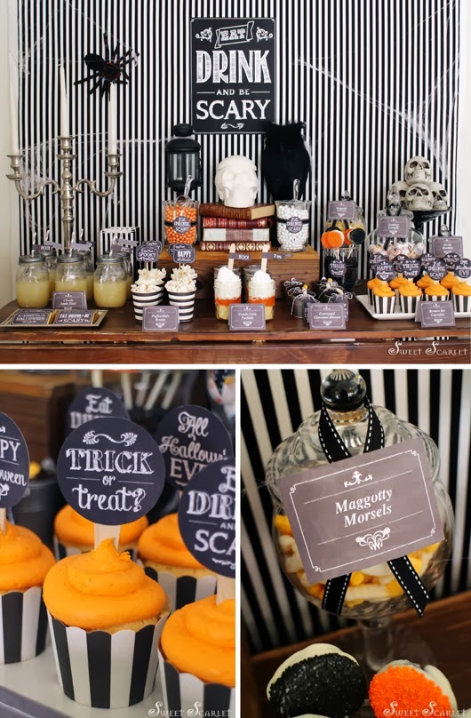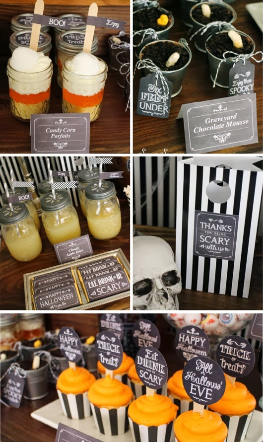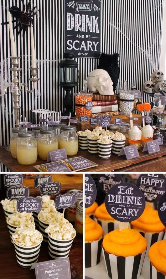 Si quieres organizar una fiesta para Halloween hecha primero un vistazo a estas imágenes. Calaveras, arañas, huesos, ojos, búhos y candelabros, todo ello sobre un fondo a rayas negro y blanco reinan en esta fiesta. Una terrorífica celebración para pasarlo de miedo.
