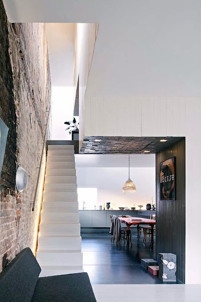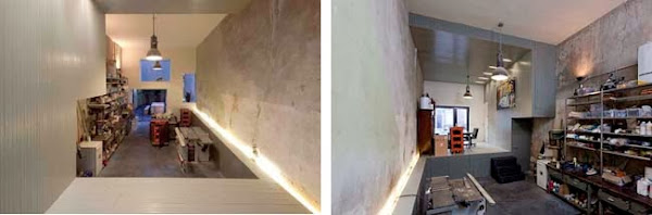 El Ayuntamiento no admitía una renovación total de la fachada, que data de 1900, por lo que se decidió darle un aire nuevo pintándola en negro petróleo, inclusive las ventanas y cristales originarios, dejándolas ciegas. Se incorporaron unas ventanas especiales, que como podéis ver son cubos de acero que sobresalen por fuera de los ladrillos.