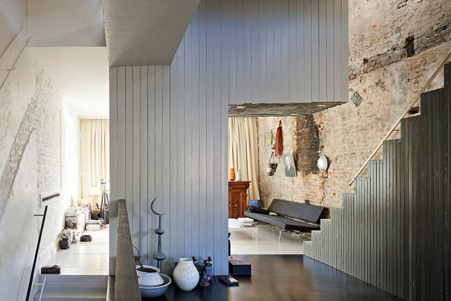 Destaca el detalle de los suelos y revestimientos de algunas paredes así como de los muebles de la cocina, hechos a medida con madera recuperada. Encontramos también algunas paredes que mantienen su aspecto visto originario y que conviven con otras pintadas en la línea cromática de la que hablábamos.