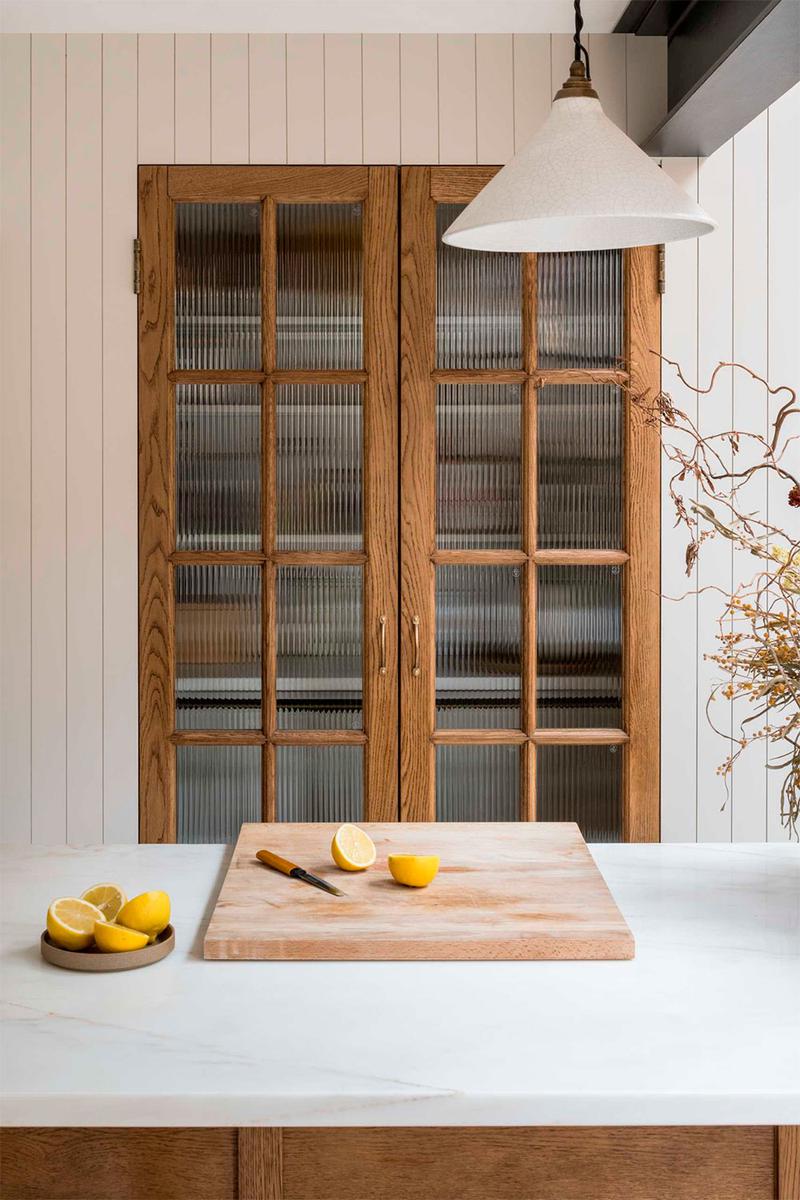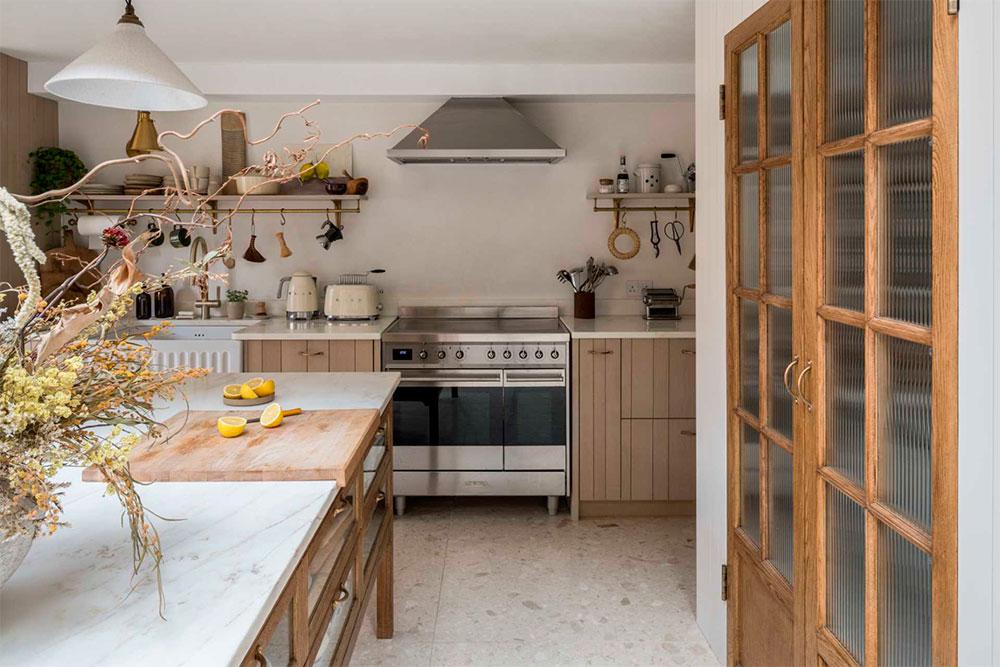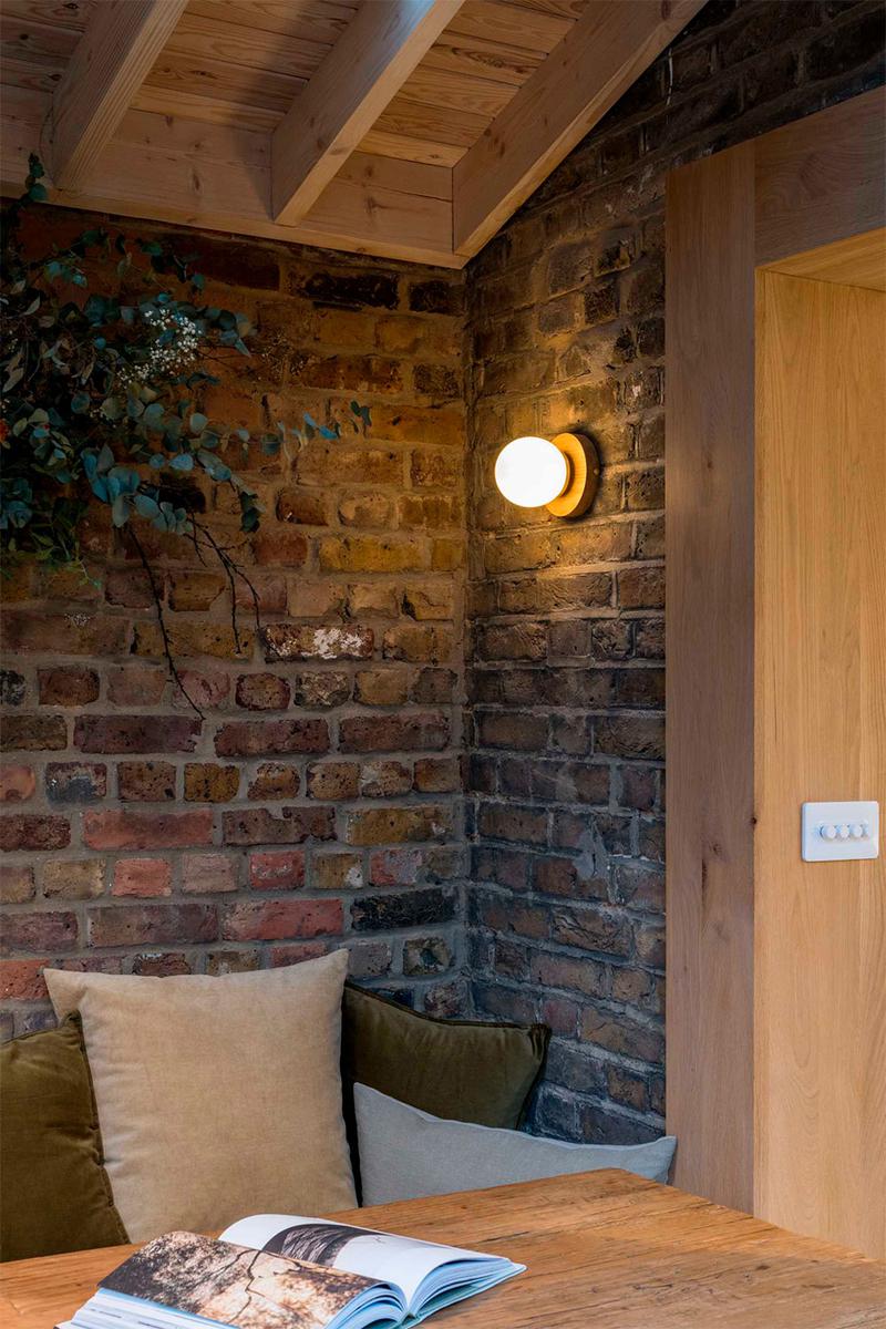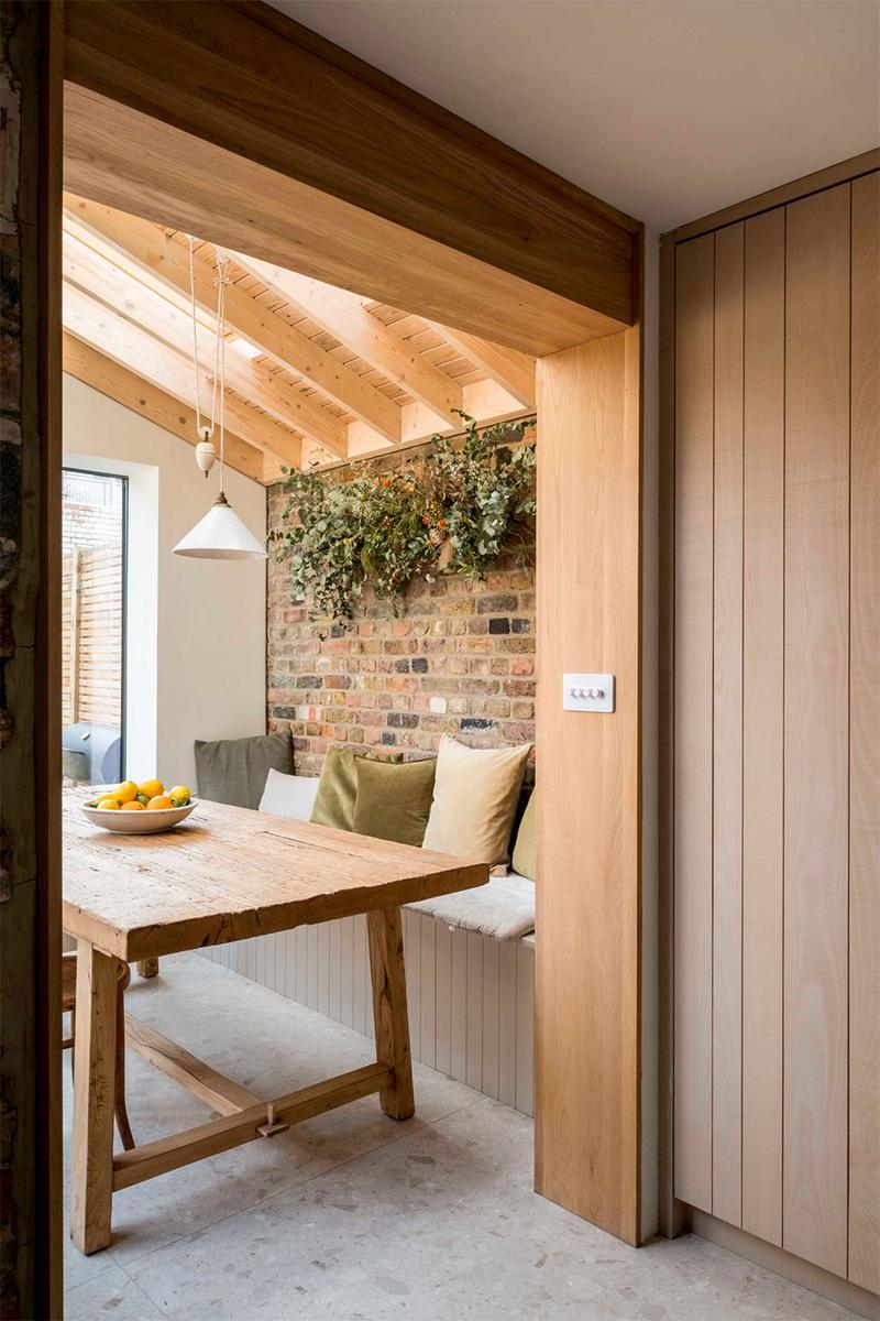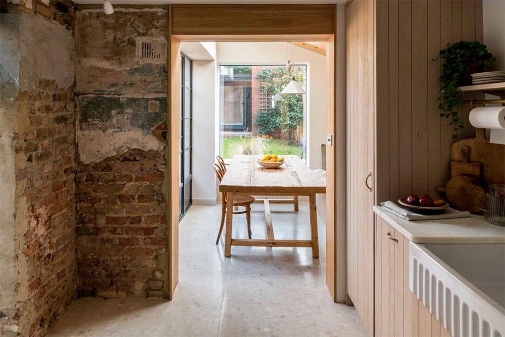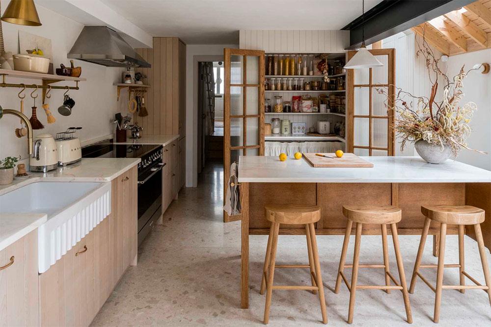 A la luz se le dio gran importancia ya que la vivienda era algo oscura, lo consiguieron gracias a los ventanales situados en la zona del comedor, vestido con una gran mesa hecha de madera recuperada. La otra extensión alberga la cocina, que tiene tres áreas diferenciadas: la gran despensa (que da nombre a esta casa La despensa Veneciana), el espacio de cocción y fregadero y, por último, una preciosa isla con sobre de mármol para preparar los alimentos. A esta, se le han adosado taburetes que permiten que Martina y Joe compartan con sus amigos el momento de preparación, convirtiéndolo en un área social. Desde allí, se puede disfrutar de las vistas al jardín. Además, gracias a la inclinación del techo, le han añadido ventanas tipo Velux que aprovechan la luz natural y resaltan las bonitas vigas de pino natural.