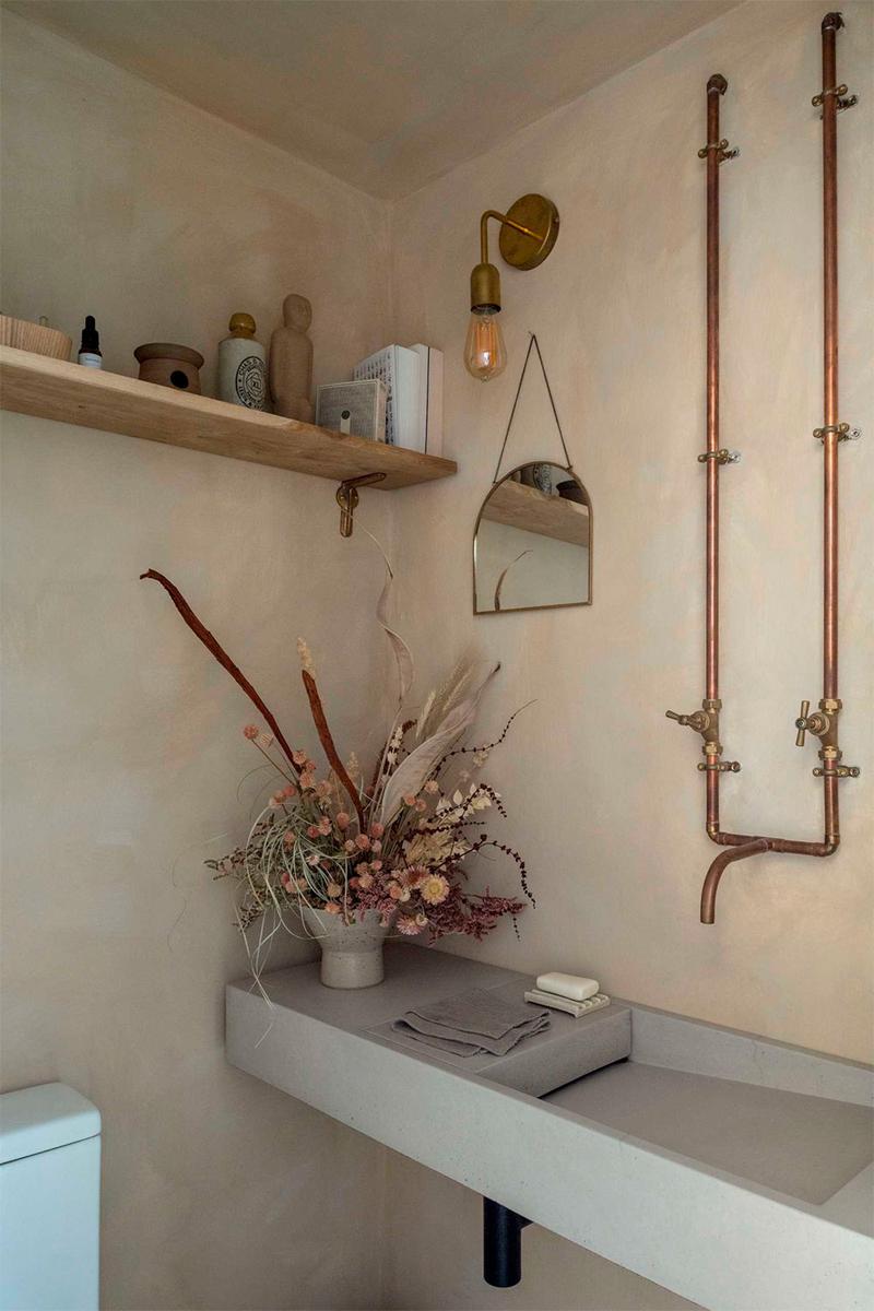 La textura terrosa, se puede apreciar en muchos elementos del diseño, pero también, en zonas que se mantuvieron en su estado original. Como la pared de ladrillo que recuerda a las antiguas paredes venecianas desmoronadas y que deja ver la impronta de su historia.