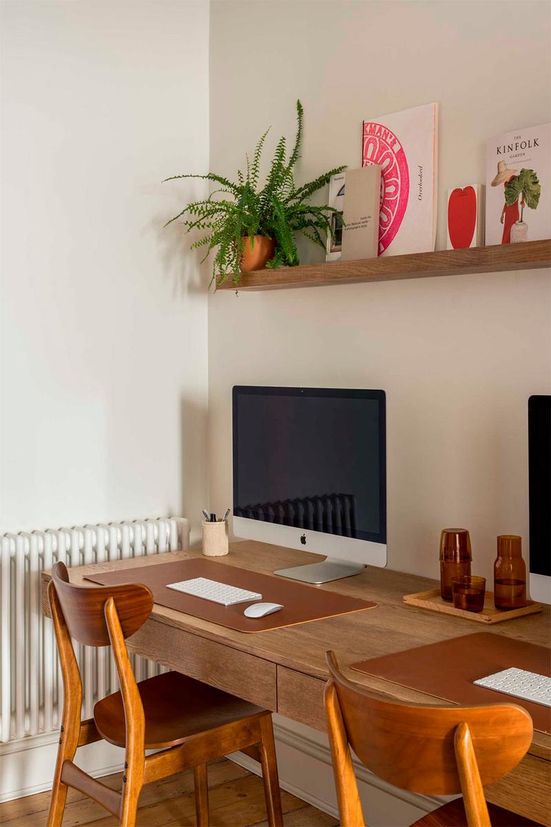 Entre la cocina y la sala de estar delantera, encontramos una zona de despacho que alberga un escritorio para dos personas. En esta parte de la casa encontramos elementos originales de la vivienda, como la chimenea del cuarto de estar o la de la habitación de invitados.