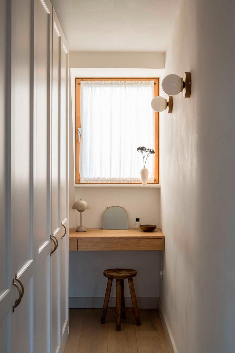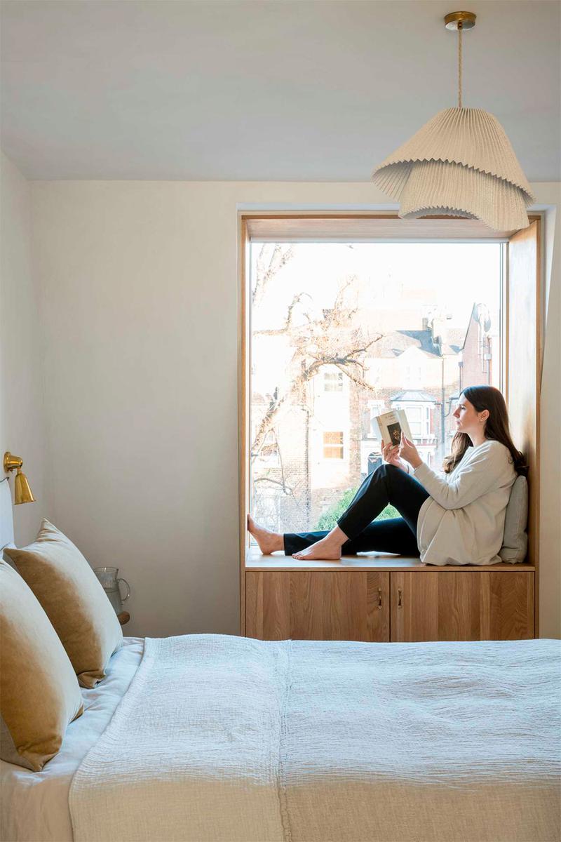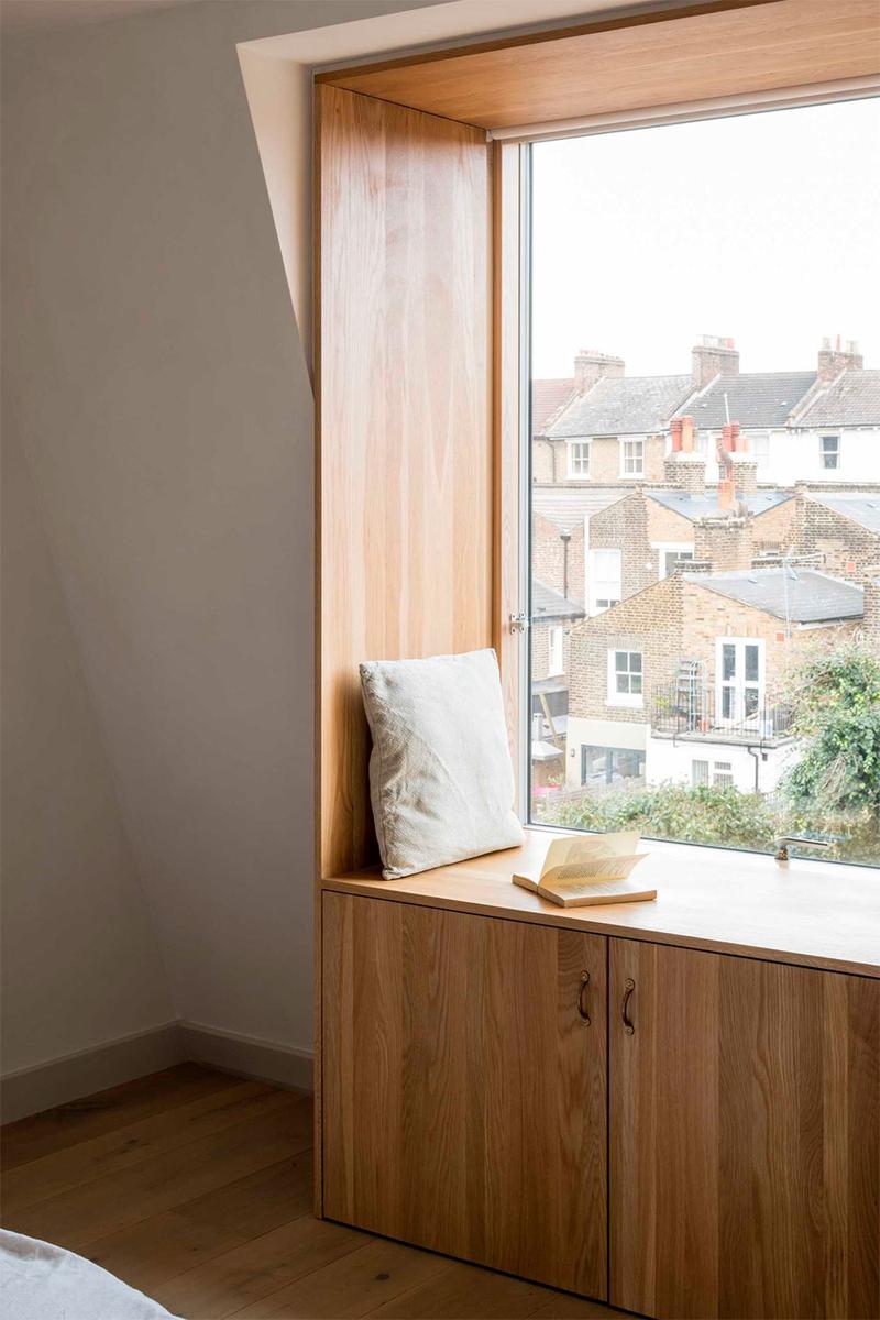 En la parte superior, encontramos el dormitorio principal con abundante luz natural, un vestidor y su propio baño. El gran ventanal, se ha enmarcado en madera y se le ha añadido un mueble bajo que sirve como almacenaje, además de un lugar perfecto para descansar, leer, o desde donde contemplar las vistas al barrio londinense. Una curiosidad de este espacio es la gran pared curva que alberga la ducha, en mármol, a la que han incorporado un asiento del mismo material.