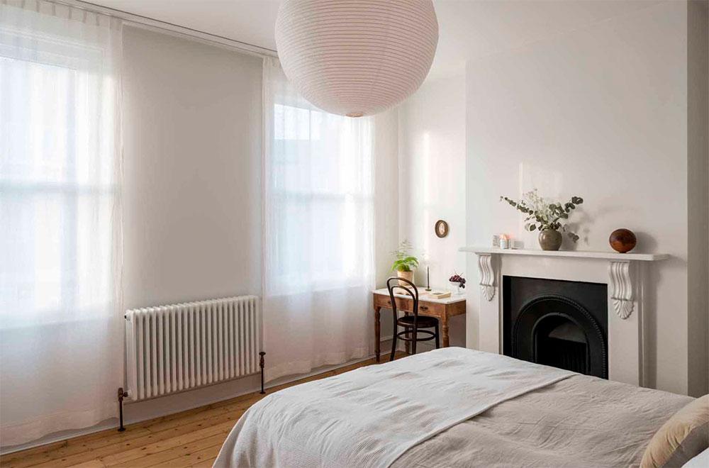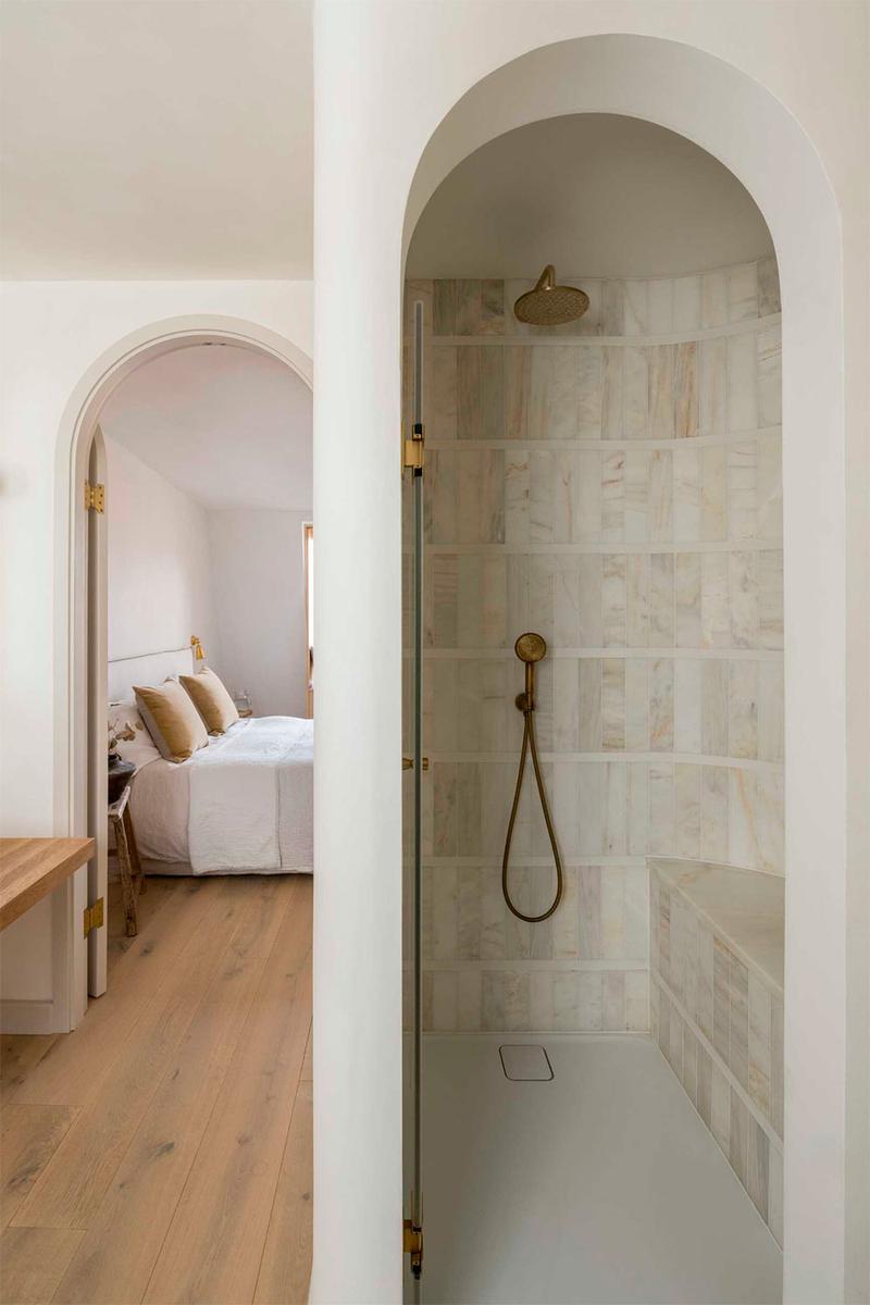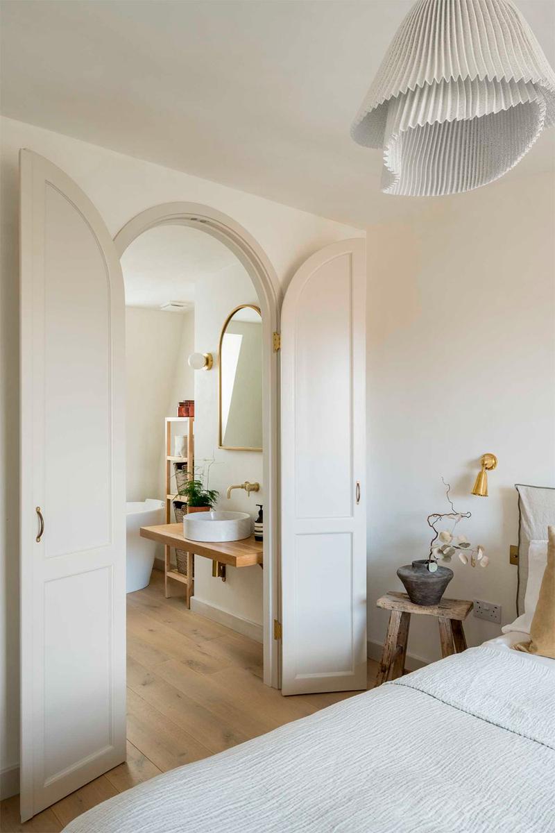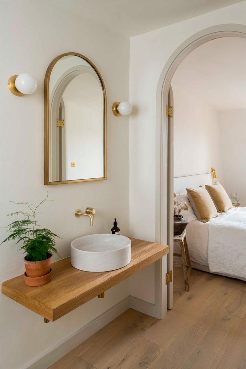 En la parte superior, encontramos el dormitorio principal con abundante luz natural, un vestidor y su propio baño. El gran ventanal, se ha enmarcado en madera y se le ha añadido un mueble bajo que sirve como almacenaje, además de un lugar perfecto para descansar, leer, o desde donde contemplar las vistas al barrio londinense. Una curiosidad de este espacio es la gran pared curva que alberga la ducha, en mármol, a la que han incorporado un asiento del mismo material.