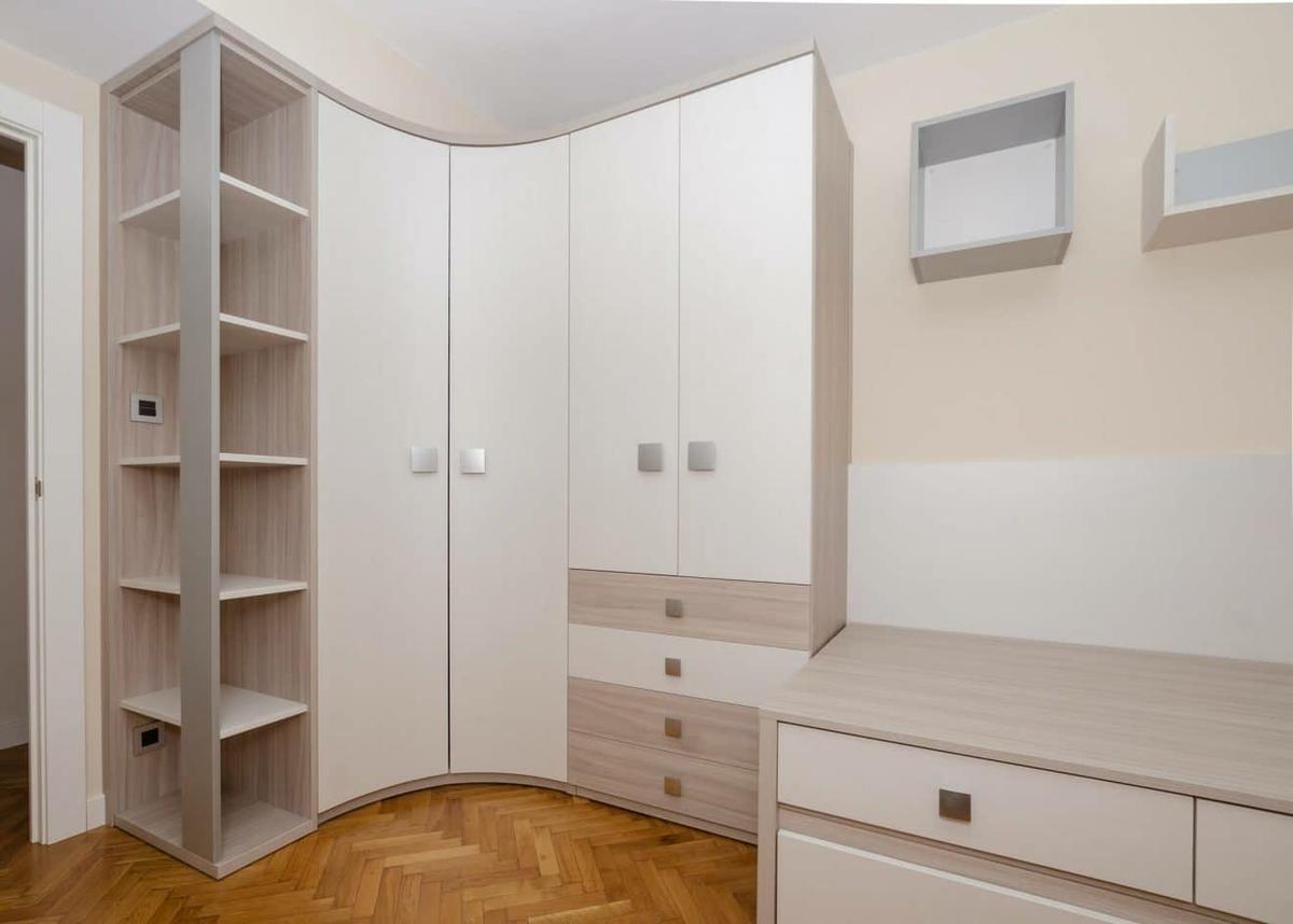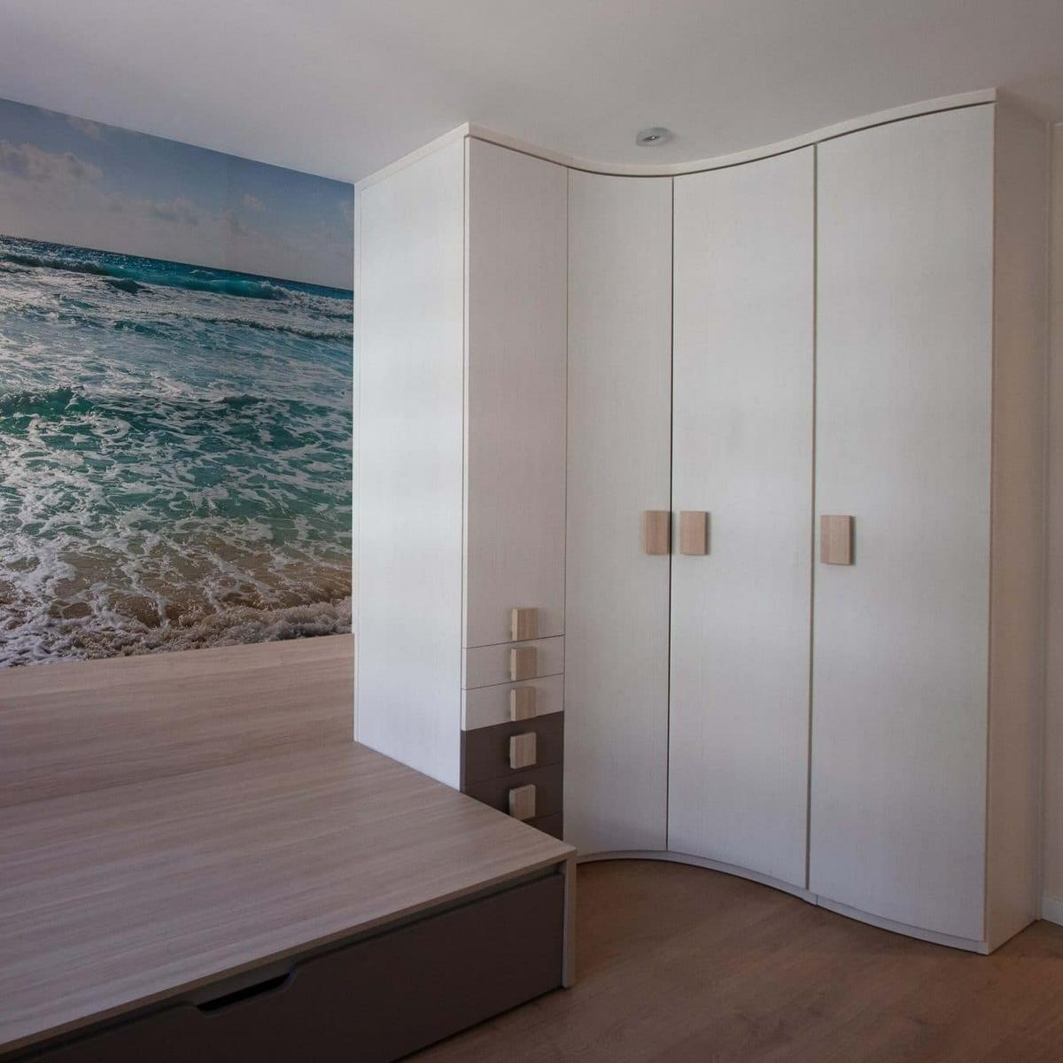 Aquí podrás ver, cómo toda la esquina se aprovecha totalmente, gracias al armario hecho a medida, según la forma angular de ese rincón.