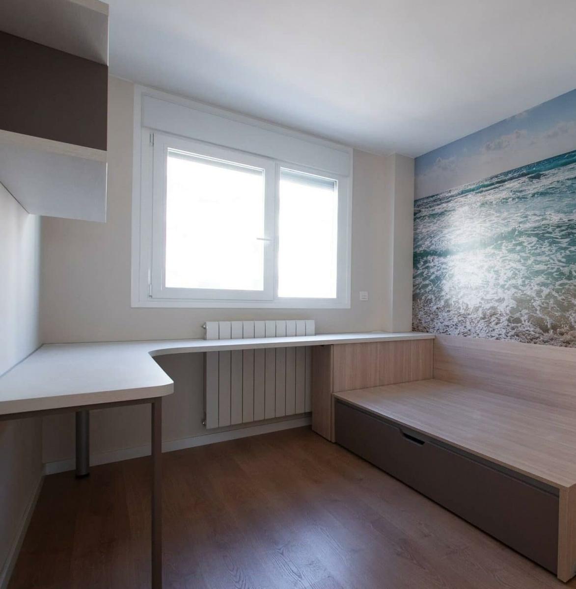 Muebles Zaragoza nos ha hecho llegar y conocer sus bonitos proyectos realizados, donde se aprecia su buen hacer y su buen gusto a la hora de diseñar, bonitos dormitorios, como el que paso a enseñarte a continuación.Donde la zona de estudio y la zona de descanso, se integran y se funden a la perfección.