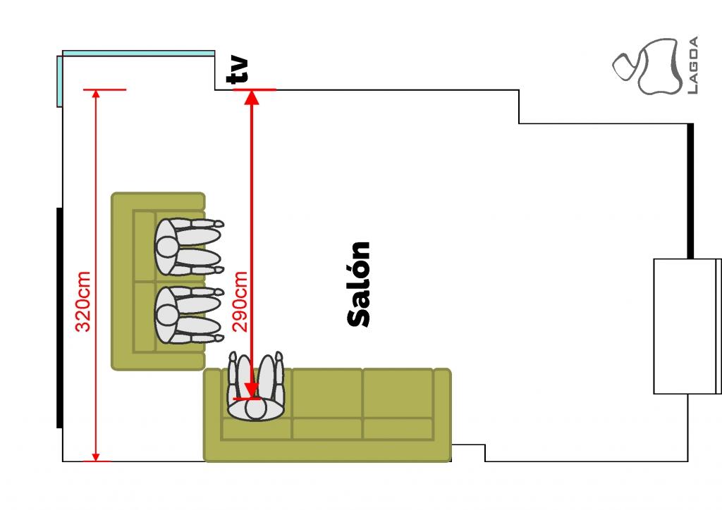 Asi que la distancia mínima tendría que ser de 1,4metros, esto me ayudaría a elegir también los sofás, como veis en el plano, desde uno de los sofás la televisión esta al límite de la distancia adecuada, pero algo hay que sacrificar. Si hubiese querido una tele más grande, por ejemplo de 42 pulgadas, la distancia mínima habría sido de 192cm, así que el sofá pequeño ya sacrificaría bastante más la visión desde el asiento más cercano a la tele, se podría haber puesto también, sabiendo que desde ese punto no se debe ver, espero que esto os ayude a elegir vuestra tele, ya que el tamaño del salón no es tan fácil poder elegirlo…