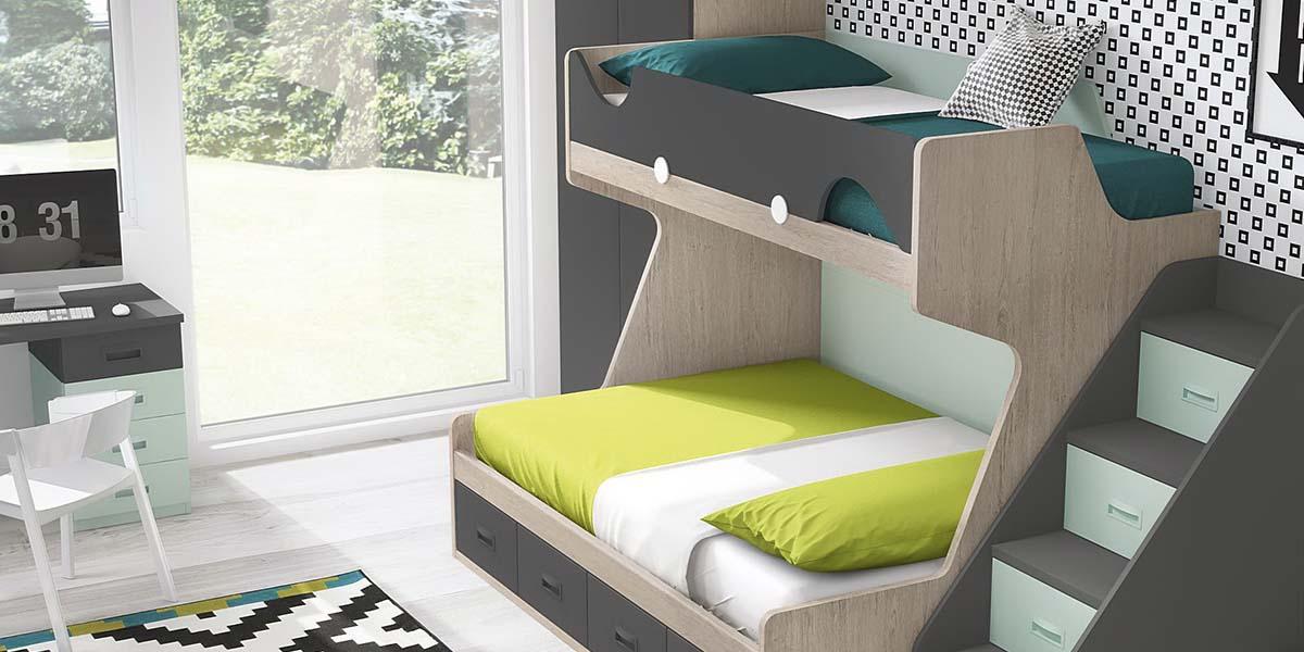 Las literas son otra genial idea que nos ayuda a ahorrar espacio en las habitaciones en las que deseemos tener dos camas. Suelen usarse en habitaciones infantiles o juveniles compartidas, ya que les permite tener más espacio y poder añadir un escritorio para hacer los deberes. Además, en la actualidad encontramos muchísimos modelos de literas que son muy funcionales. Esta por ejemplo cuenta con almacenaje en cajones en la parte inferior y en las escaleras.