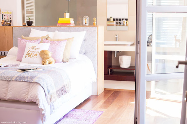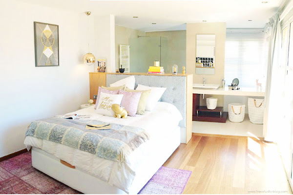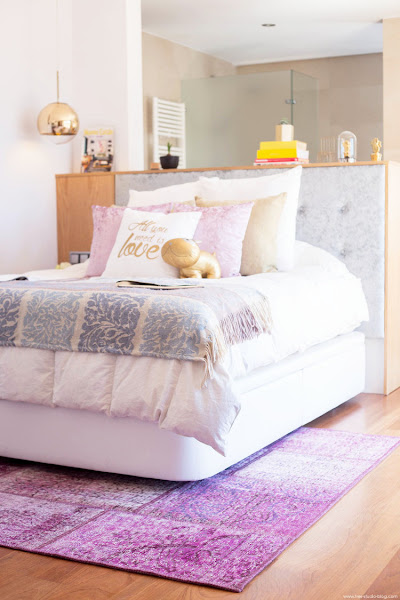 6- Utiliza el color y los estampados para remarcar o destacar un rincónEsto es algo que resulta muy, muy efectivo si queremos destacar un rincón determinado dentro de una estancia, o si queremos diferenciar un uso concreto en una estancia que tiene varios usos. Esto es algo que nos pasó en una de nuestras reformas más recientes, donde un mismo espacio compartia zona de dormitorio, de estudio y de baño. Así que recurrimos al modelo de patchwork en la gama de los rosas de Parentesi Quadra (un color muy acertado ya que era un dormitorio para una chica joven), y el resultado les encantó, porque consigue destacar la zona de la cama y darle mayor calidez. A ver qué os parece a vosotros...