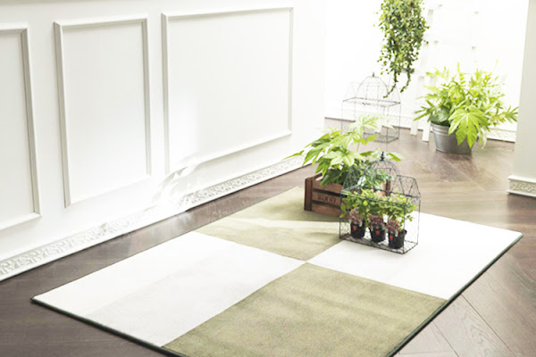En esta otra imagen, vemos cómo también han utilizado el toque de color verde de la alfombra para destacar ese pequeño rincón con plantas, potenciando así el efecto relajante del verde natural.