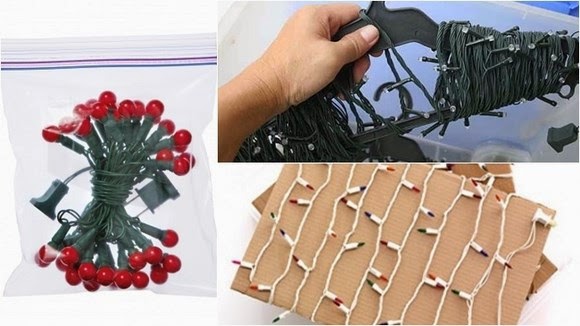 4. Otro truco genial es usar cartones y perchas para guardar las luces del árbol, así evitamos los "líos" y nudos que se hacen las guirnaldas todos los años.