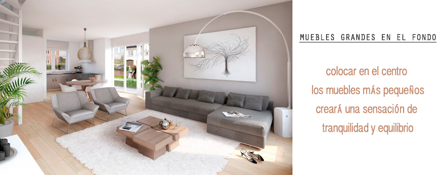 En un hogar siempre tenemos muebles de gran volumen como pueden ser los sofás y las mesas para comer, como idea os puedo decir que si colocamos los muebles más grandes en el fondo reduciremos considerablemente el espacio, por eso, es aconsejable colocar en el centro los muebles más pequeños para mantener una sensación de tranquilidad y equilibrio.
