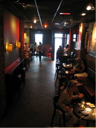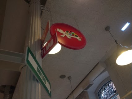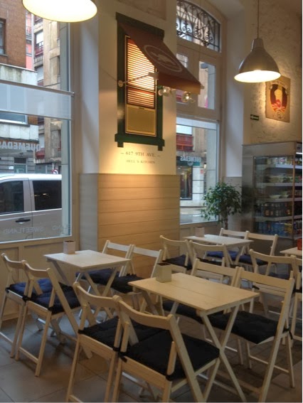 El suelo era una auténtica monería, combinado con unas sillas sencillas de pinza blancas con cojines en negro para hacer contraste, perdido entre unos altos techos que dan una amplitud al lugar perfecta, llenito de lámparas ideales que cuelgan desde arriba y dan una luz súper acogedora... sin olvidar claro está todos los detallitos americanos, como señalizaciones, carteles o paredes pintadas..
