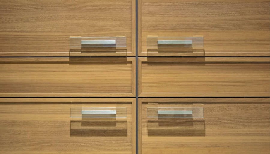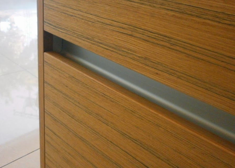 Tiradores tallados en la propia puerta o frente, a manera de ranura. Propios para identificar una marca, como éstos de Porcelanosa.