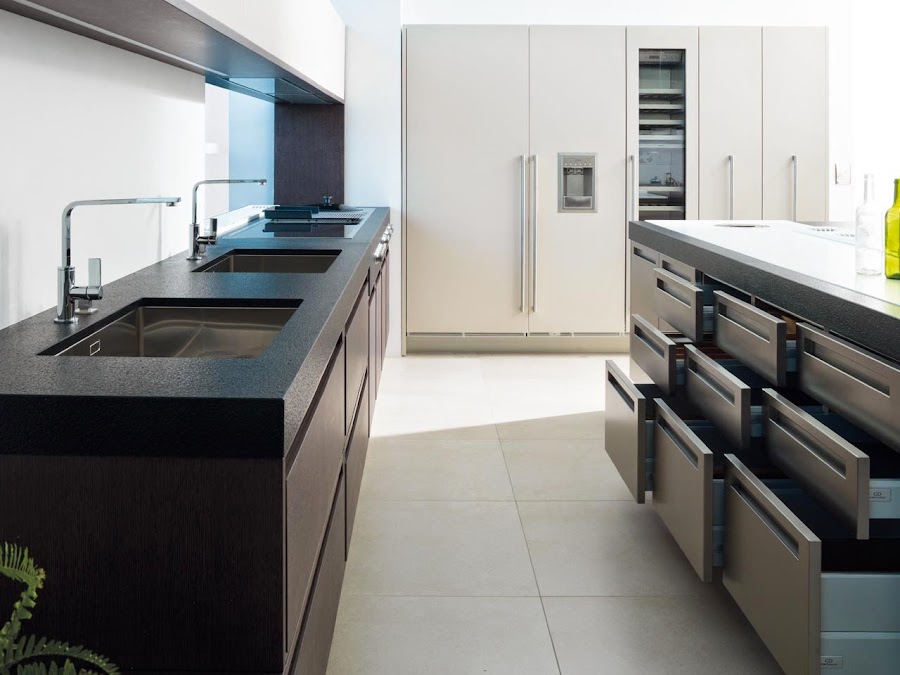 Este modelo de Siematic, no lleva tiradores de ningún tipo para permitir una superficie ininterrumpida y utiliza un sistema de apertura electrónica.