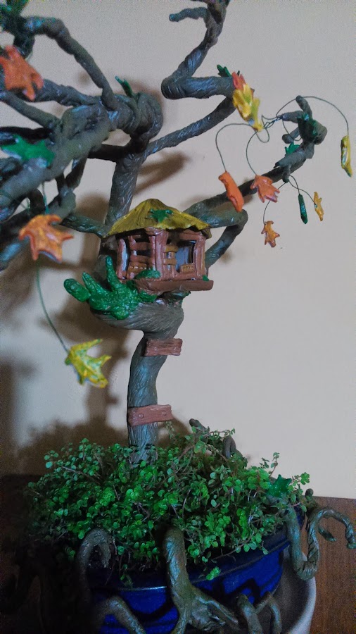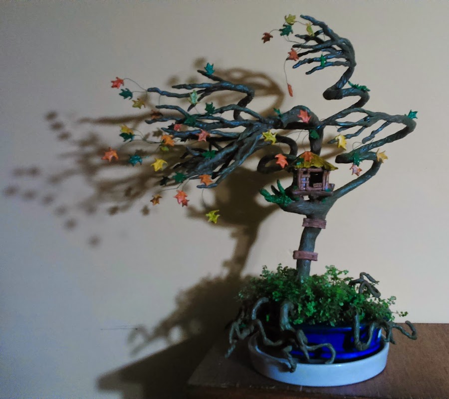 Simplemente tome un envase o masetero que tenia de un bonsai que se me seco hace un tiempo y lo transforme en la base para crear un bonsai artificial. el siguiente paso fue con mucho alambre darle forma al árbol creando ramas espirales que apuntan hacia un solo lado (simulando el movimiento del viento). después de ello cubrí con cinta pegote para fijar el alambre y por ultimo cubrí con masilla epoxi dando forma y textura de árbol.