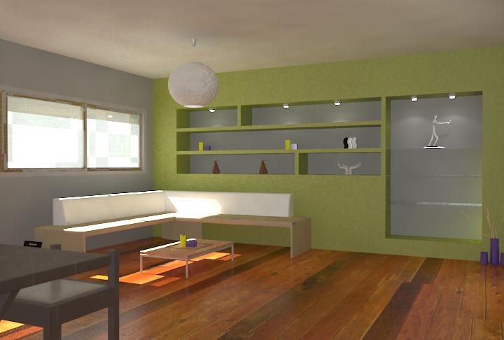 Cabe destacar la iluminación situada en la los huecos del mueble de pladur, que son ojos de buey, los cuales crean un ambiente agradable provocado por una luz indirecta a la persona que se encuentre en el sofá, pero directa sobre los objetos situados en las baldas.