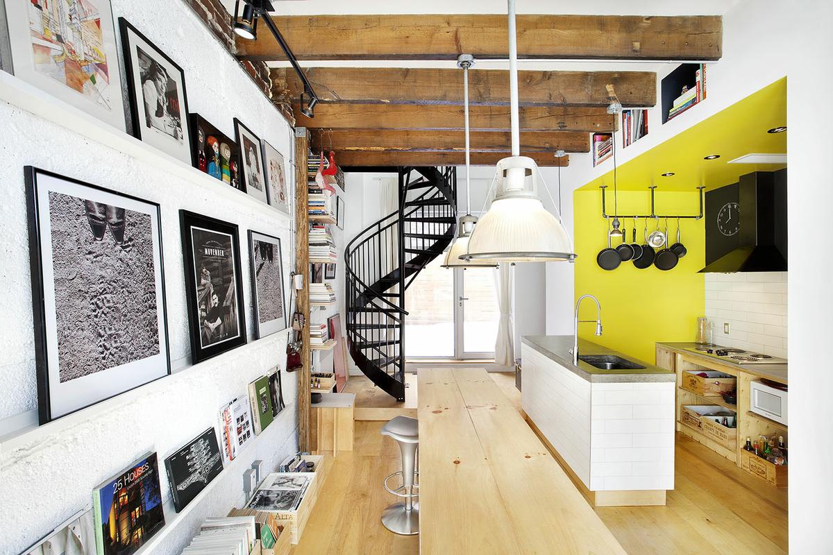 En la planta baja el espacio de la cocina de concepto abierto se abre sobre el resto de la estancia q hace las veces de espacio expositivo y de trabajo .una gran mesa-isla de acero y madera natural rompe el espacio y hace las funciones espacio de trabajo y de mesa para comer según el momento