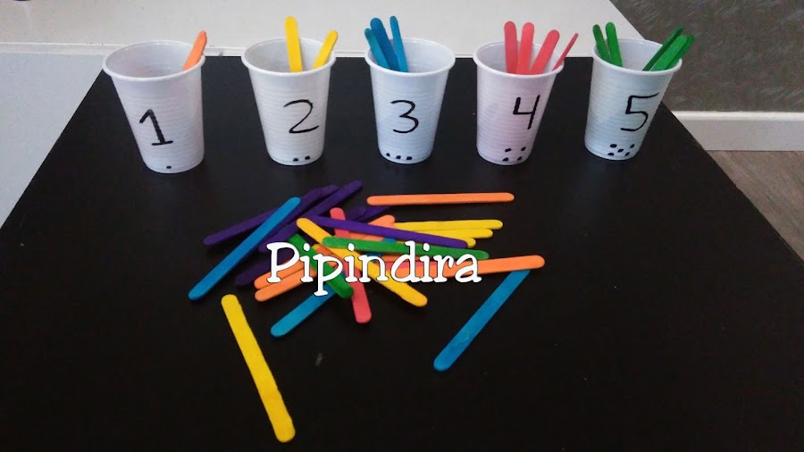 Sólo necesitamos palitos de madera un vasitos . Como podéis ver en los vasos he dibujado unos puntitos. Antes de poner ningún palo le he explicado un poco. Hemos contado los puntitos , él sabe contar del 1 al 20, y una vez que lo ha contado hemos visto que número es. Después de hacer esto un par de veces hemos empezado por el primer vasito, hemos contado los puntos y al decirme qué número era le he pedido que pusiera 1 palo. Lo mismo con el 2, primero cuenta los puntos, luego me dice que es el número 2 y le he pedido que meta 2 palos. Se lo ha aprendido enseguida y le ha gustado mucho.
