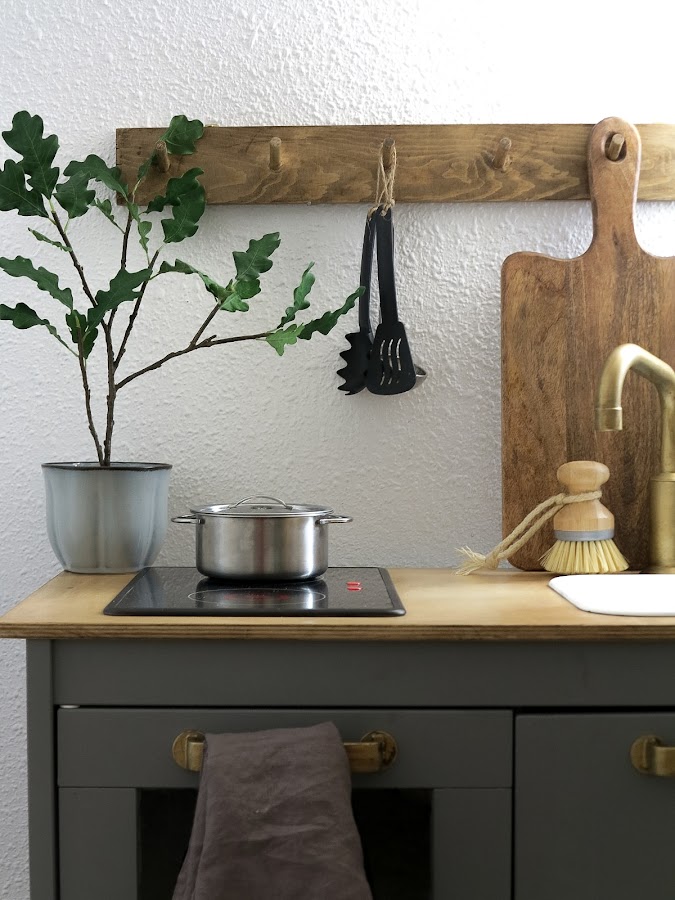Aria comienza a entrar en la etapa de la imitación, y una de las cosas que más le gusta últimamente es entrar en la cocina conmigo a ayudarme, así que decidí que era el momento de comprarle su propia cocinita para que jugará ella cuando le apeteciera cacharrear. Por supuesto elegí la famosa cocinita DUKTIG de Ikea para tunearla yo misma y darle ese toque que combine con la casa. Aria tiene muchos juguetes de colores pero una vez termina de jugar se guardan en sus cestas y sacos y no se ven, pero este tipo de juguetes más grandes que tienen que estar a la vista prefiero que sean a demás de funcionales y que le guste jugar con ellos, que sean también decorativos.