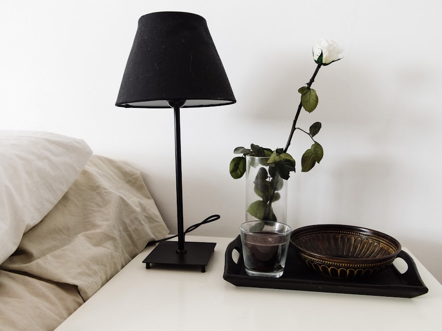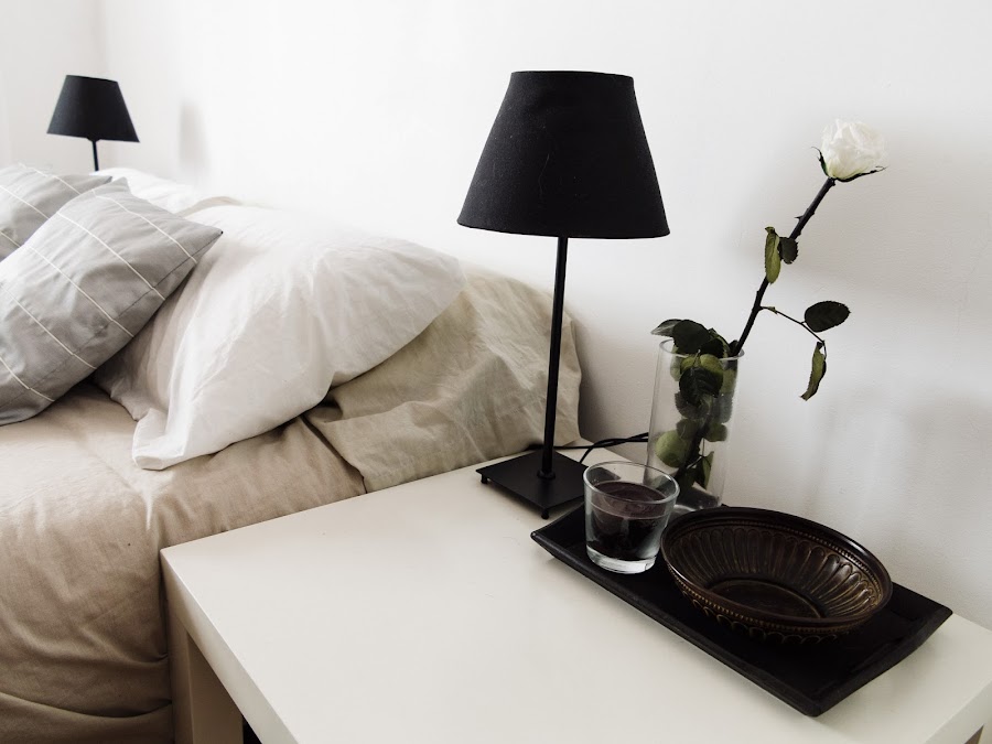 En las mesitas de noche, tengo unas lámparas negras para que hicieran juego con el ?cabezal?, las bases son de LeRoy Merlín, una ya la tenia de casa de mis padres y solo compré la otra y las pantallas son de un bazar chino y me costaron, dos euros cada una. En un lado de la cama hay un marco plata que da un punto de elegancia junto a los cojines a la luz que aporta el blanco de los otros cojines y la manta de los pies de la cama y una caja negra para guardar cosas, ya que no tenemos cajones en las mesitas, al igual modo he hecho en el otro lado pero con un cuenco de casa Adela y lo he colocado junto con una vela y una rosa blanca en una bandeja en el mismo tono que las lámparas y el cabezal, para tenerlo todo mas ordenado.